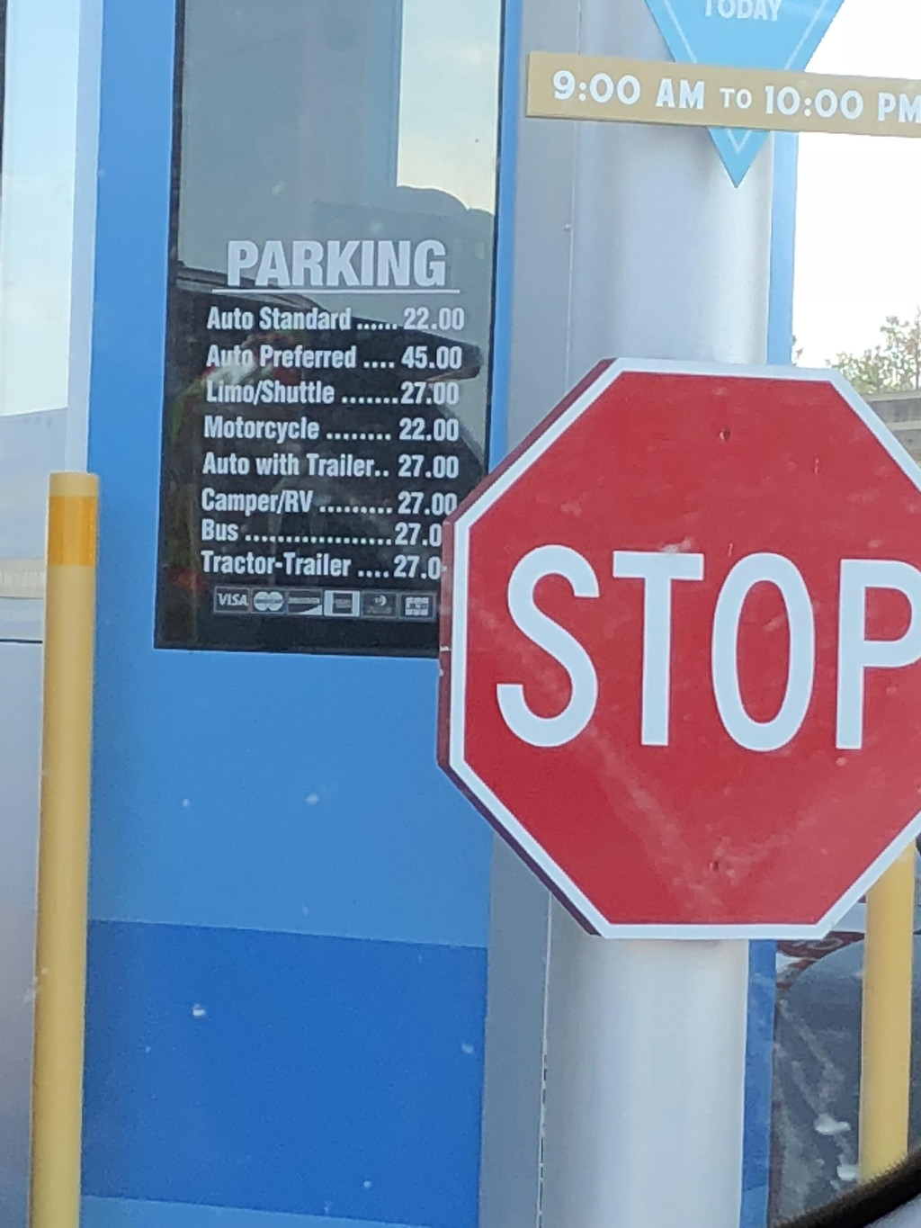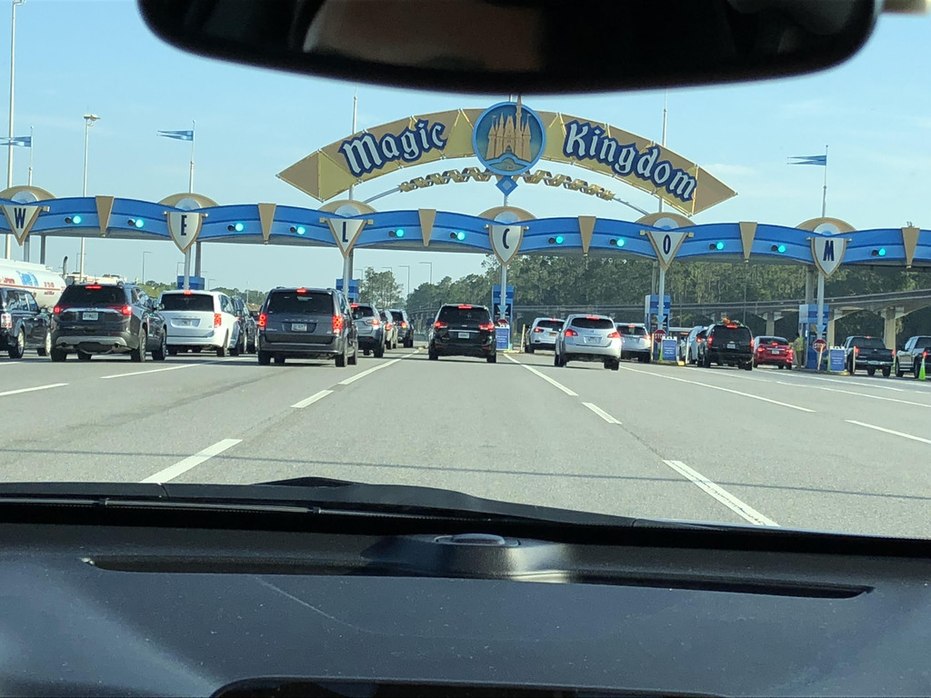 从酒店开车过去,到达Magic Kingdom停车场,也就二十分钟时间。远远地就看见Magic Kingdom的大招牌,一下子心情就high起来啦。进入停车场,小轿车普通停车场停一天22美元,换算成人民币蛮贵的,但是也没有办法只能停。停车场有专员指挥,看上去都是70多岁的老头,美帝的老人也蛮辛苦的,退休金少,只能出来继续干活。大家一辆接着一辆,依次停靠,非常有秩序,美国停车的方法是车头朝里。我们到达的时候,是早上九点不到,这是诺大的停车场已经接近一半被停满了,后面的车还在陆陆续续地不断开进来呢。当然,如果你肯多付一些停车费--45美元,就可以停到离乐园最近的Preferred Parking优选停车位喽,如果你停的是优选停车位最后几排,那么和普通停车位前几排就没有什么区别了