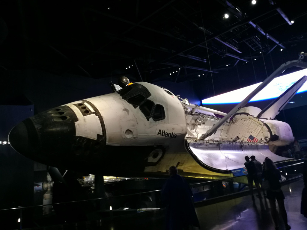 参观完土星五号火箭,再往里面走,就是Atlantis亚特兰蒂斯航天飞机展馆了。进入展馆前,游客们会先观赏几分钟的投影,了解该航天飞机的发展历史。接着,投影的幕布徐徐上升,幕布后的亚特兰蒂斯号如庞然大物般展现在大家眼前。