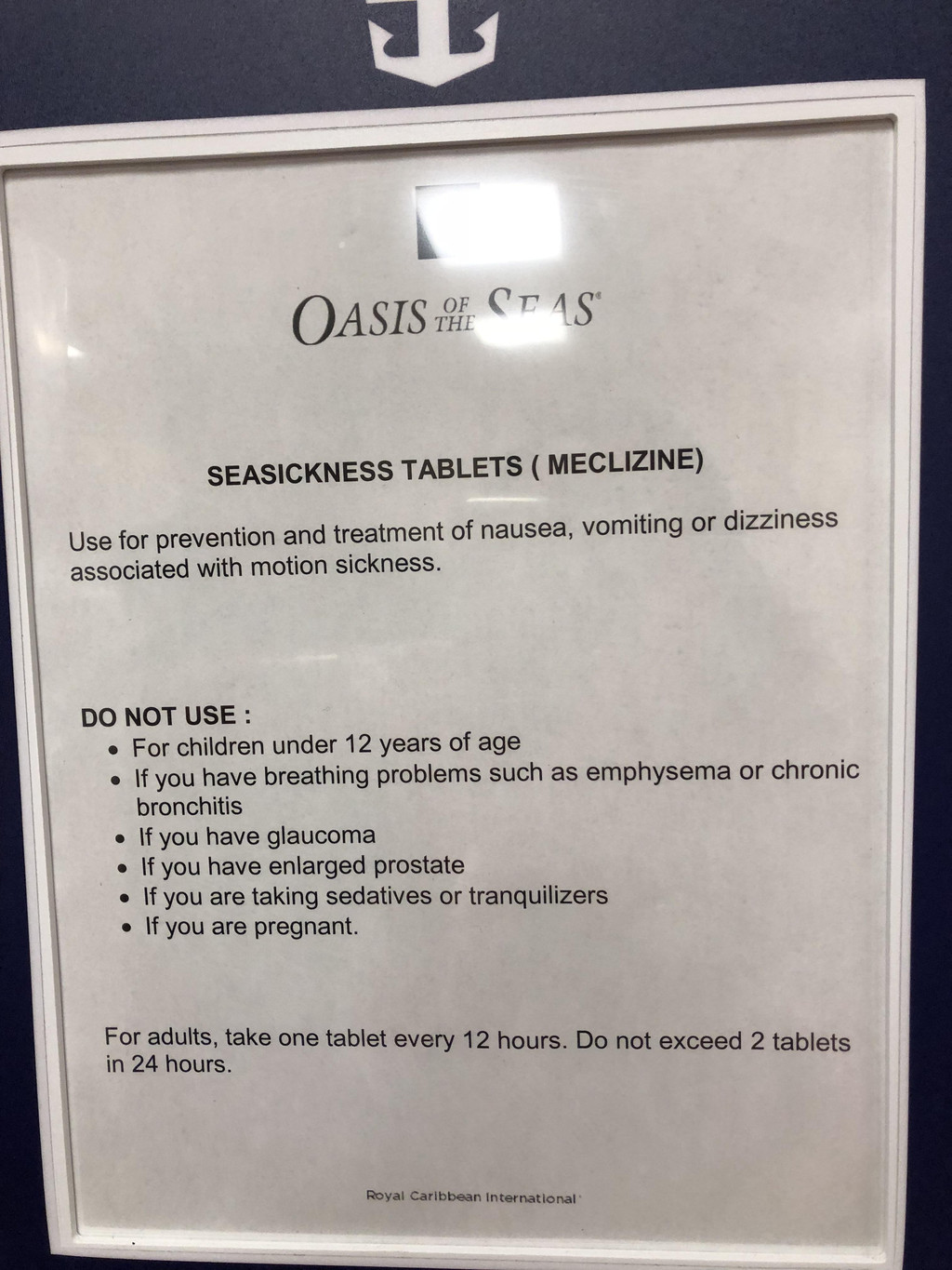 自助餐厅里的服务生大多来自发展中国家,从他们佩戴的胸牌上能看到姓名和国籍。有南美洲国家来的,也有很多亚洲国家来的,比如菲律宾、马来西亚等。这些国家都是讲英语的国家,所以到美国来打工语言就不成问题啦。我们竟然还在自助餐厅里遇到了来自中国的服务员,而且是离上海很近的南京哦,真是“他乡遇故人”啊,格外亲切。我们聊了一会儿,当她得知我这两天有点晕船之后,建议我到2层的医务室去拿一些晕船药吃。晕船药就放在医务室门口,阅读服用须知后,游客可以自行取用。赶紧服下一片,下午睡个午觉,到了傍晚时分,果然晕船症状好多了。幸好有这药,让我之后船上的行程可以吃得下,玩得舒服!