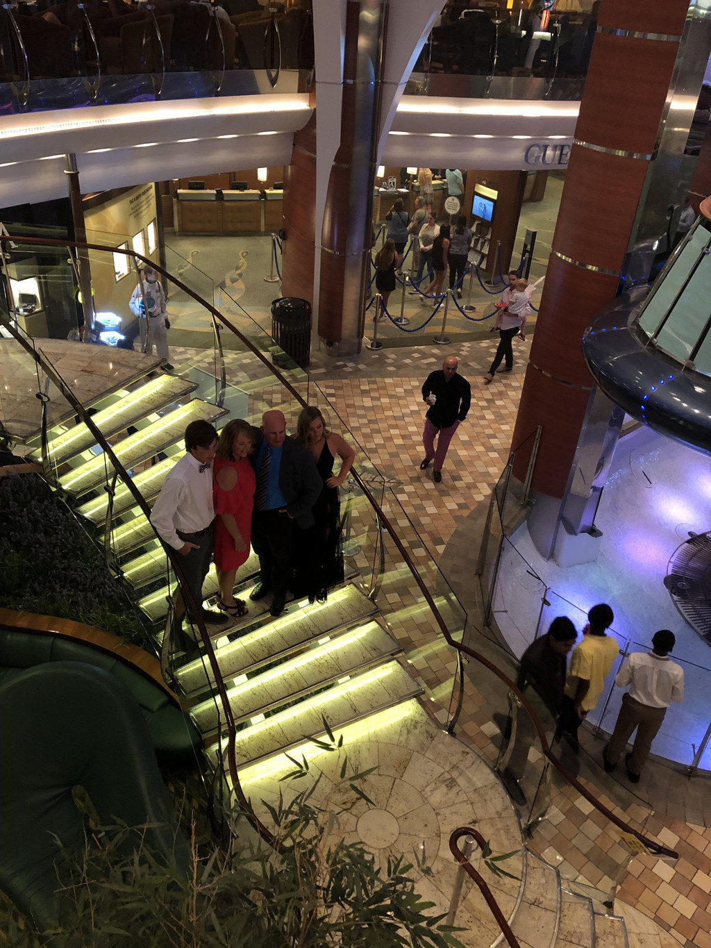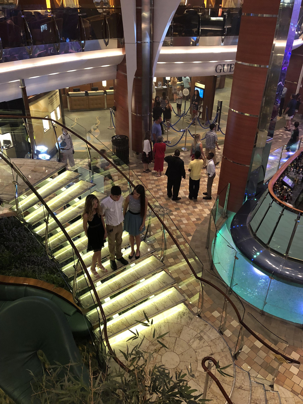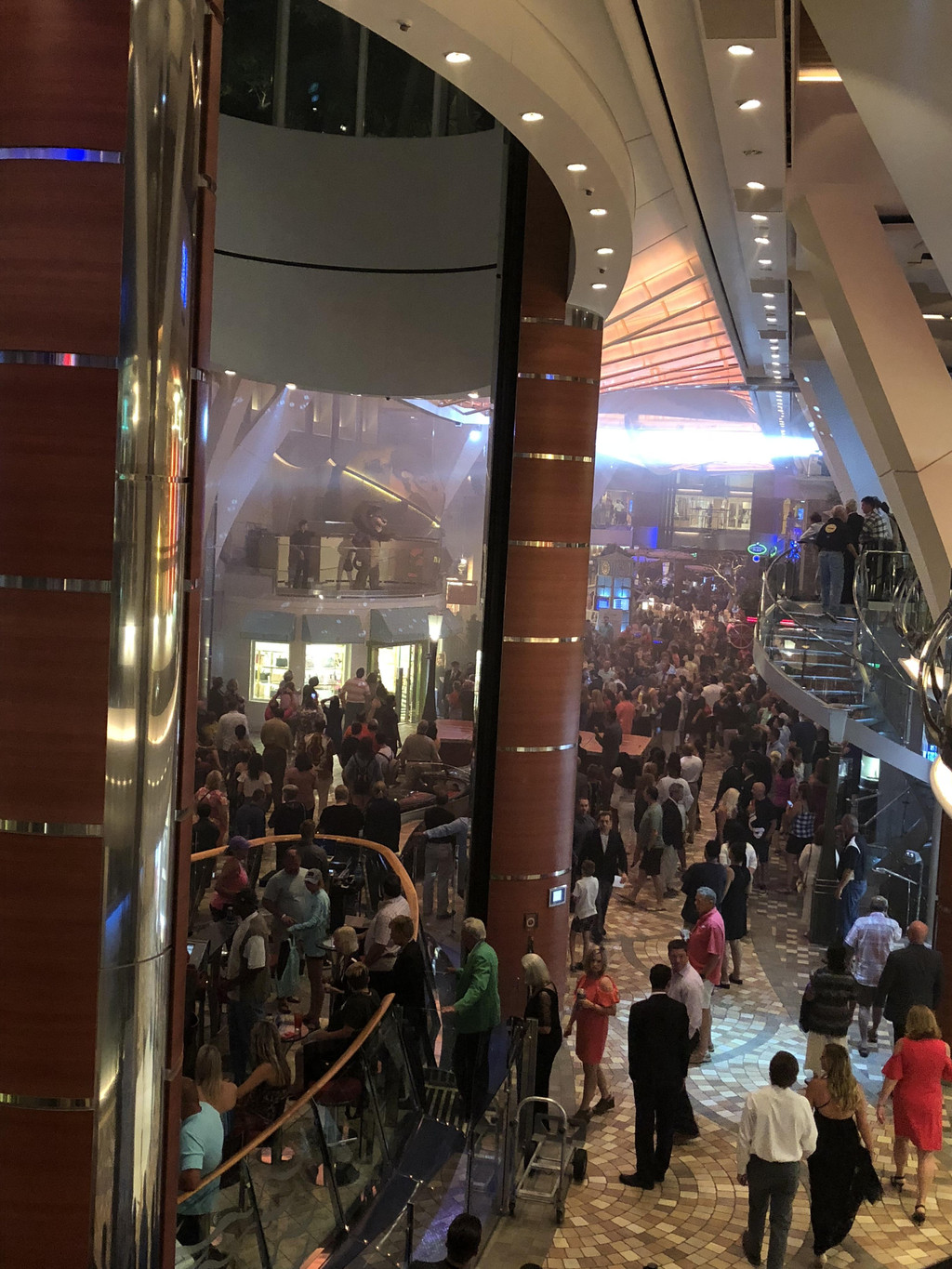 境外邮轮的演出是可以事先在网上或者App上预定的,你有预定的话,可以刷卡认证后先行进入,没有预定的就先在外面排队等候,等到开场前再放你进去,里面还有VIP和套房的位子,是事先留好的。不像境内出发的邮轮,演出剧场,大家都哄进去,还有霸位的。