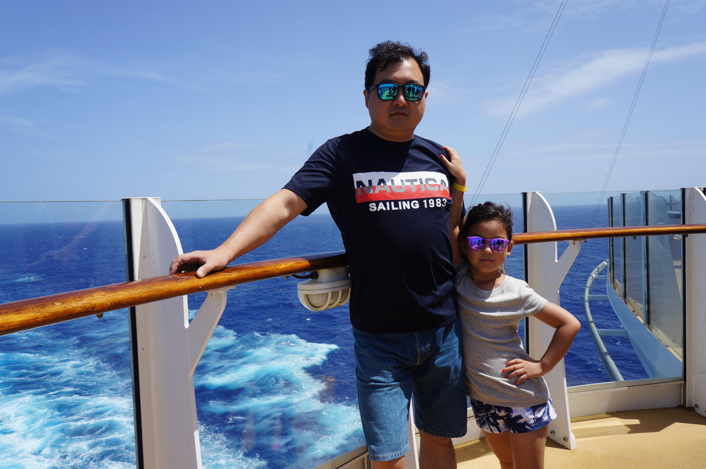 下午继续睡个午觉,到了四、五点钟左右,太阳开始落山,我们就去游泳了。这个时间点来,躺椅空出来不少了,不像中午左右来,躺椅基本上全部坐满。冲浪池、旋转池、还有儿童喷水池,萱宝玩得不亦乐乎!在游泳池里,孩子们之间也会互相交朋友。说一句:Can I play with you? 就可以一起玩啦。在游泳池边上,有两处拿冰激凌蛋筒的机器,游客可以自己放冰激凌,量少量多自己随意。让我想到去年在海洋水手号上,也有冰激凌机器,但是都有专人负责做,游客排队拿,还有人插队。而在这艘船上,大家排好队,一个一个自己放冰激凌,可见游客的素质大不同。