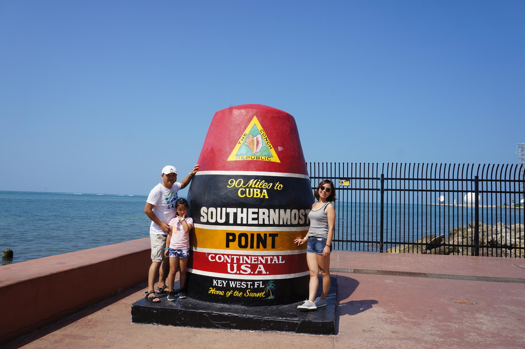 继续往前走,到了这条路的尽头,看见了大海,以及最南端的一块石碑:Southernmost Point Continental USA,美国大陆最南端,这边离隔海相望的古巴只有90公里,所以在佛罗里达这块大陆上,南美长相的人比比皆是,而基韦斯特小镇上也处处充满了南美风格的装饰元素,比如我们酒店Shuttle Bus车头上的大公鸡。