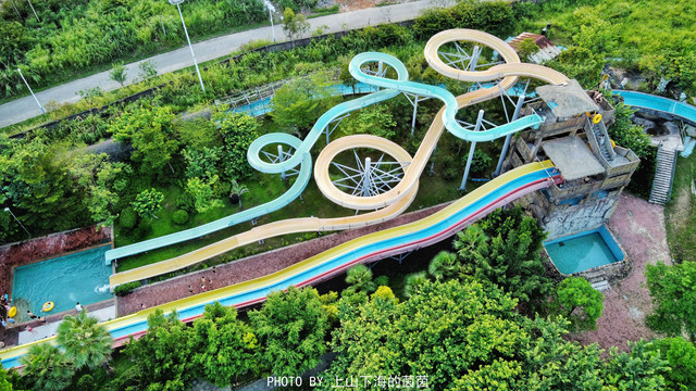 由5组滑梯组合而成,其中3组竞赛滑梯、2组旋转滑梯;最高的自由落体式滑水道可从18米高处以时速60公里速度俯冲直下,带来难以置信的高空滑翔快感。