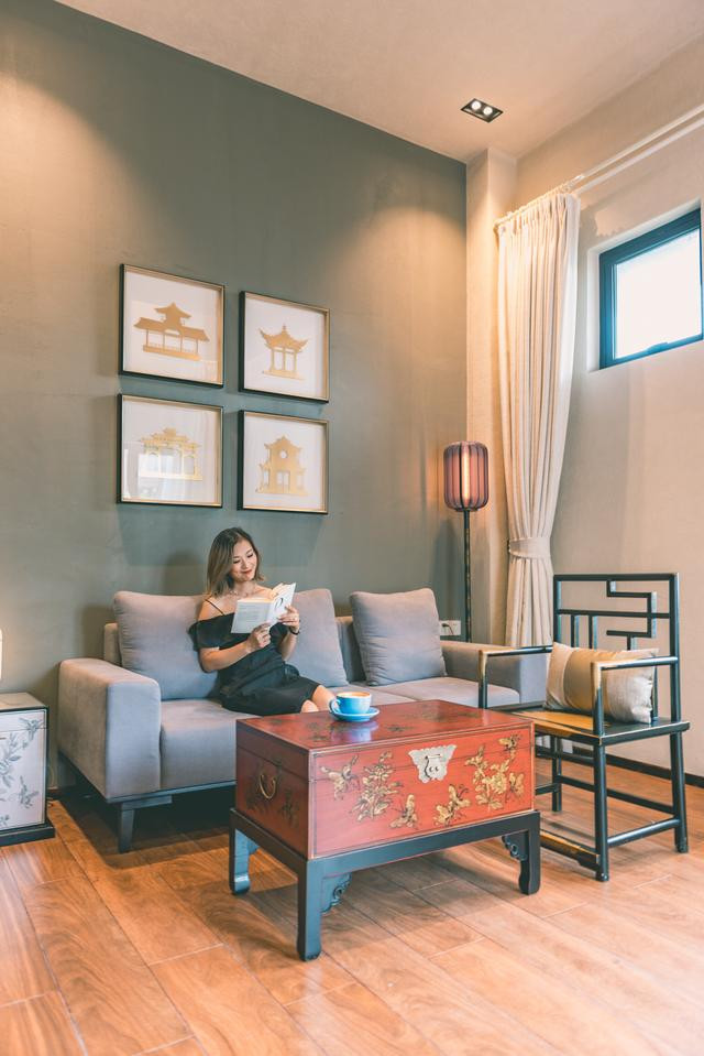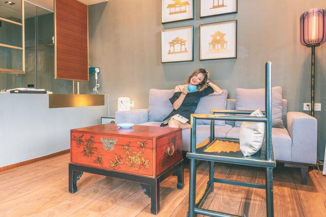 我们的房间叫西塘,这间以江南水乡命名的房间是间充满新中式品味的套房,卧室和客厅相连,望园林的大露台,兼顾了私密和风景。