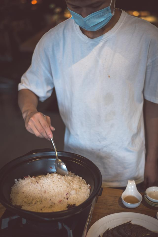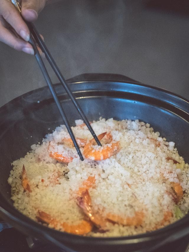 有些菜式当面烹饪更让人感到期待,例如这道盐焗虾。
