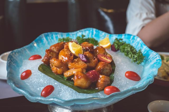 这道冰镇果香咕咾肉一入口便让人惊艳,肥瘦比例适中的五花肉,润而不柴,酸甜可口却不油腻。而这种酸甜又不是传统的醋和糖,而是融入了水果的清香。用冰盘来上,更凸显了这种果香。