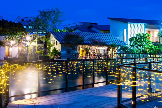 什间的夜是律动的,沿着九曲桥穿过湖面,那随风轻摆的小灯,仿佛夜空中闪烁的星。