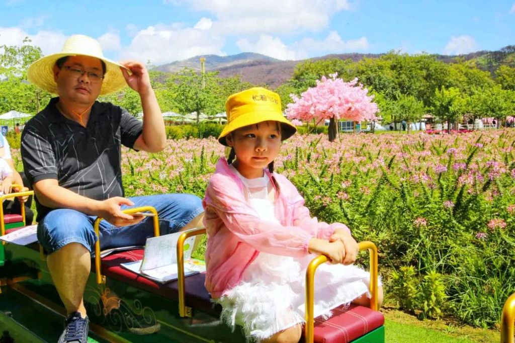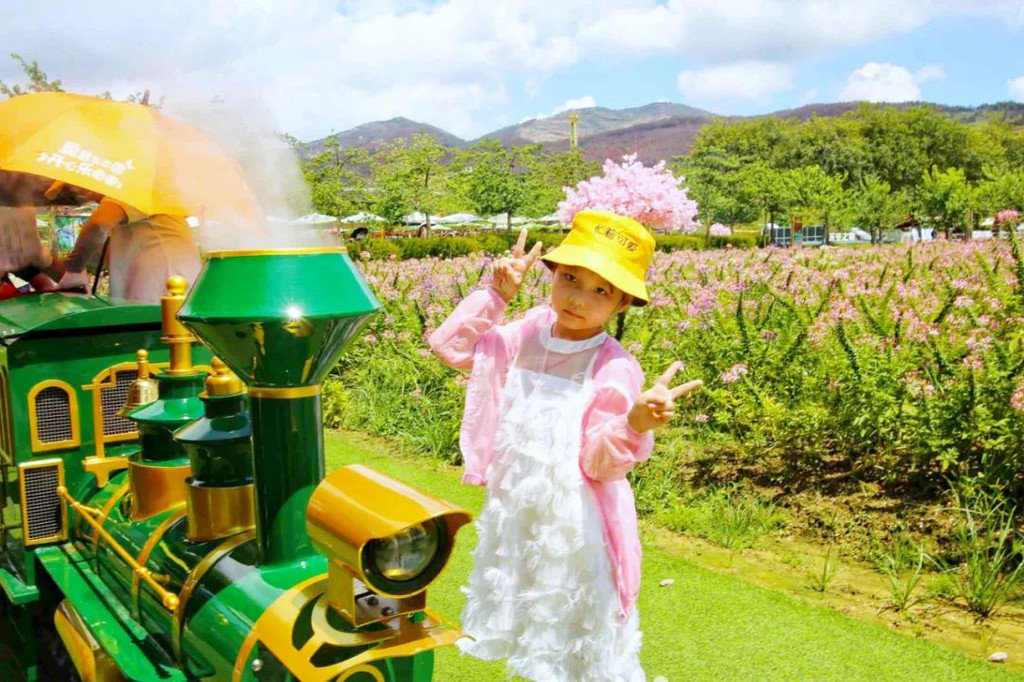 小火车徜徉于盈香五彩斑斓的花海间