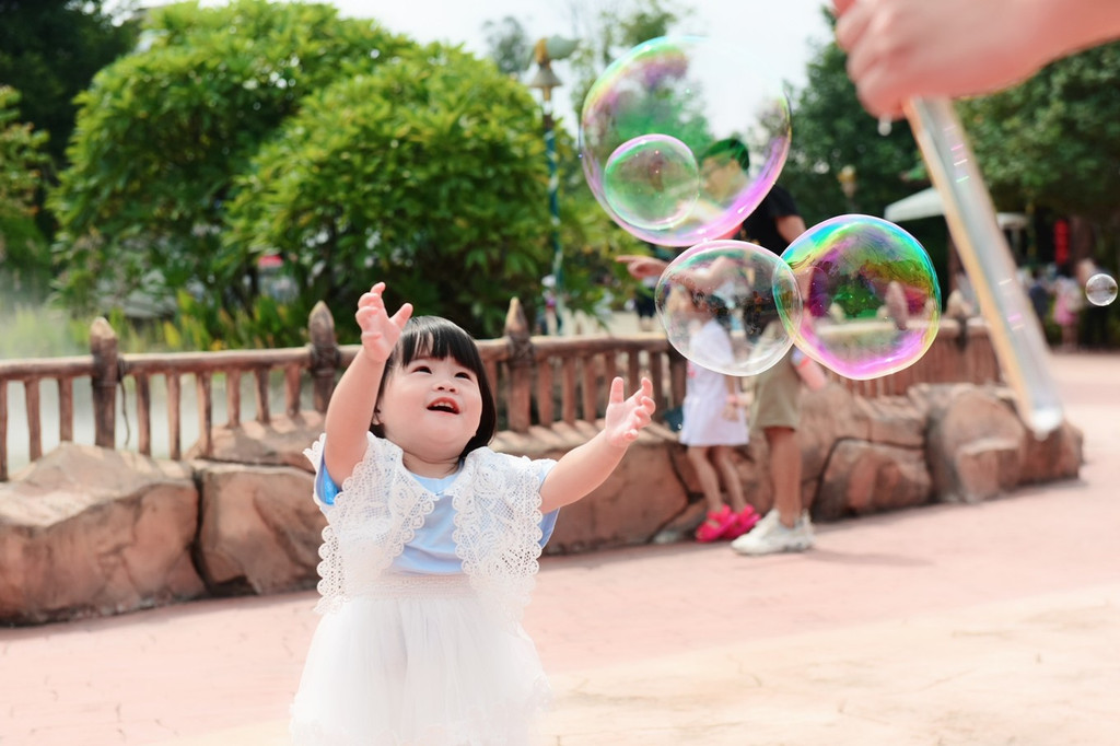 由于很多设施都限1米以上的小孩才可以玩,我们只能无奈放弃玩一下难度不是很大的项目,还特意买了泡泡棒逗她开心。忽闪忽闪的大眼睛里充满了对这个世界的好奇。