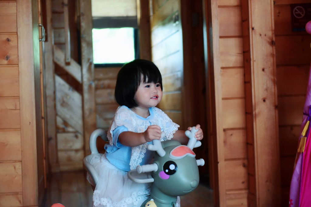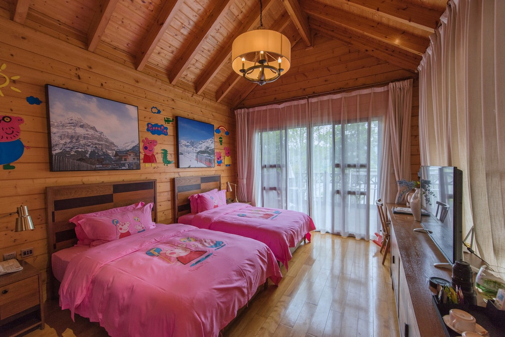 推开门的那一瞬间,就感受了满满的惊喜,房间布置的特别温馨,是小女生喜欢的小猪 佩奇 的风格,里面还放置了摇椅木马及一顶小帐篷,玥玥一进房间就迫不及待的坐上去玩儿了起来。