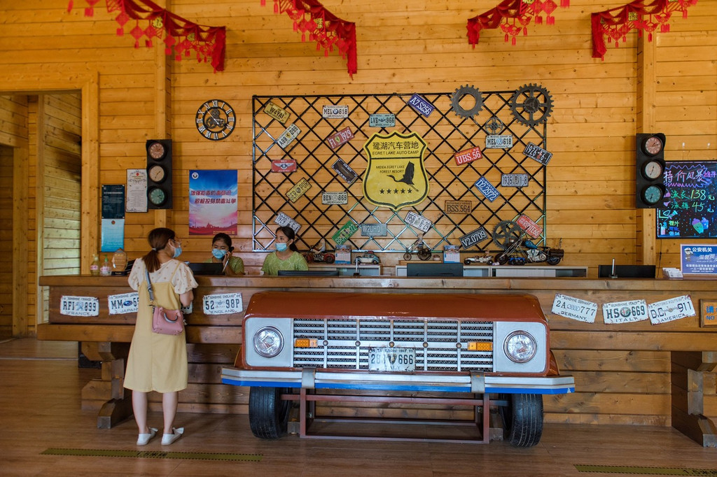 滑完雪已是下午,到了在鹭湖汽车营地办理入住的时间,他们的前台设计的别具一格,是一个汽车头的模型,背景墙上贴满了各种各样的车标很吸睛。后边还设置了书吧、桌球台等消遣区域。