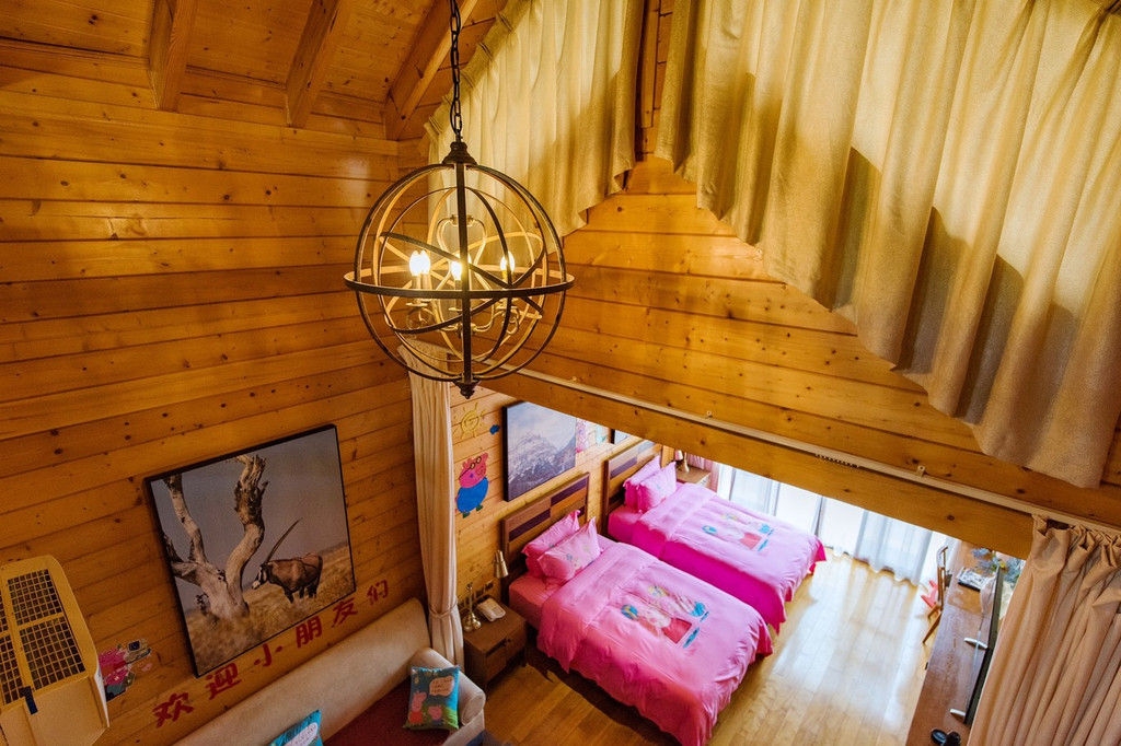 沿着楼梯往上走就到了阁楼区域,这里放置了两张榻榻米床,空间很大,特别适合一家老小来住(整栋五口人都没问题)。房内的配备设施齐全,除了常规的以外,洗漱台还贴心的放有宝宝专属的儿童牙刷。木屋的构造是 加拿大 进口樟松,质量特别好。