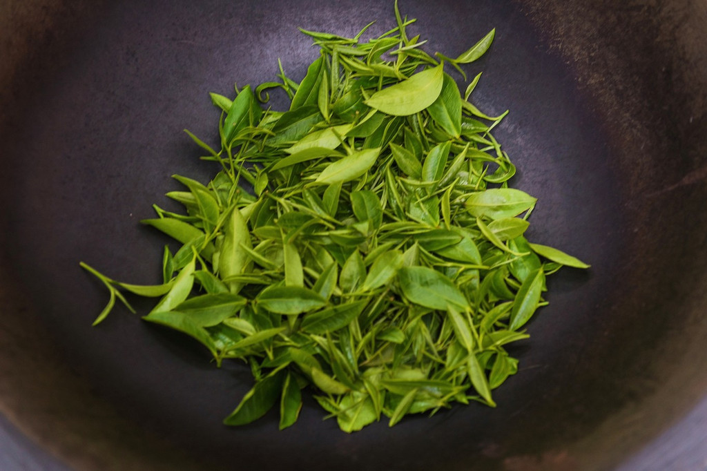采完的茶叶就可以拿到工作室来发烫的电锅里炒了,整道工序看似简单,又需要一些精妙的手法,一直要不停的翻来覆去的把翠绿色炒到干枯为止。