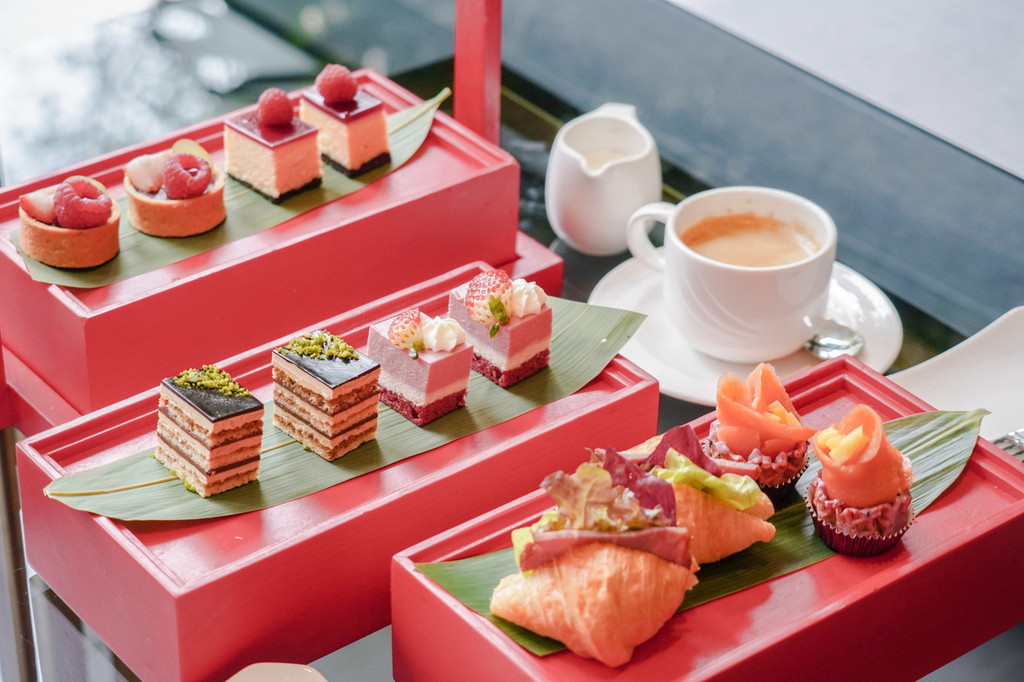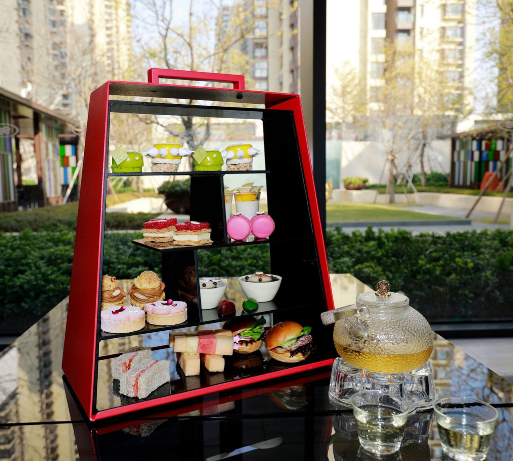 下午茶除了西式的,还有中式风哦,红色的食盒里装着各样甜品,甜品下面还垫着新鲜的粽叶,给人不一样的风格体验。