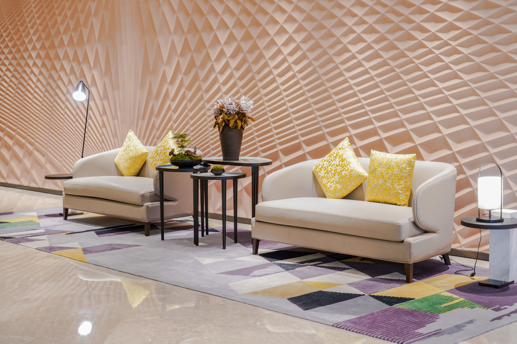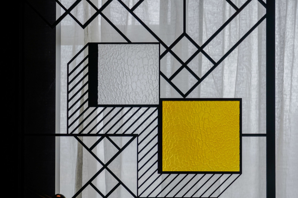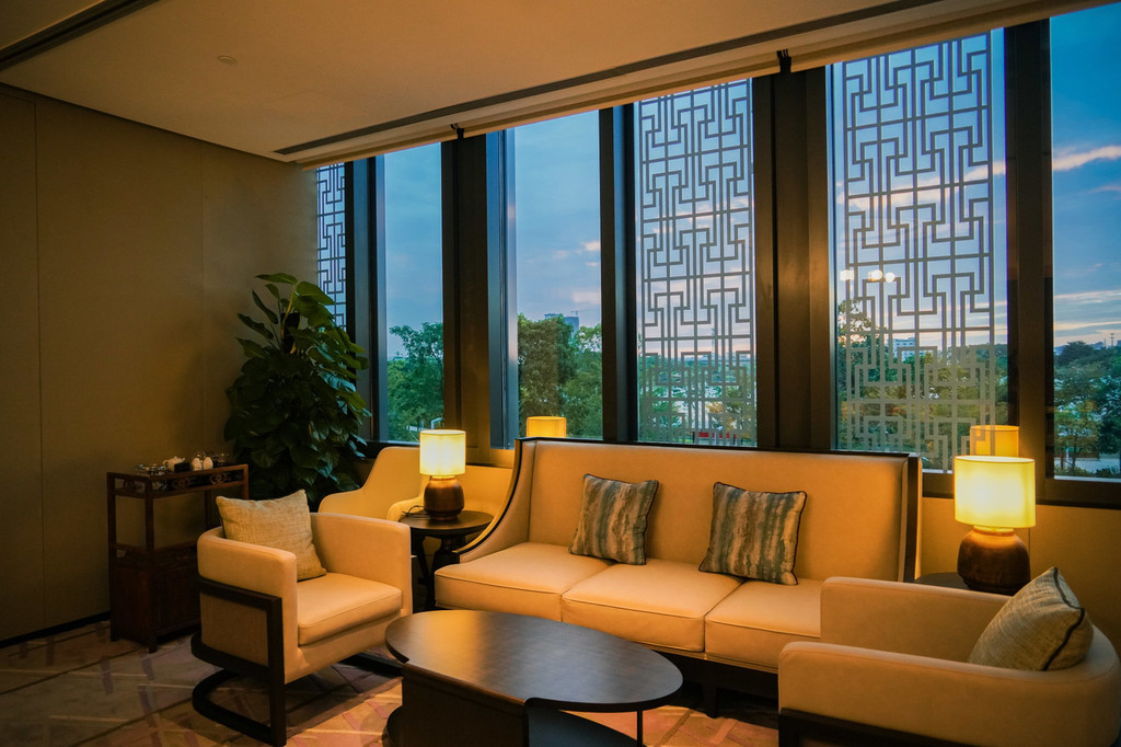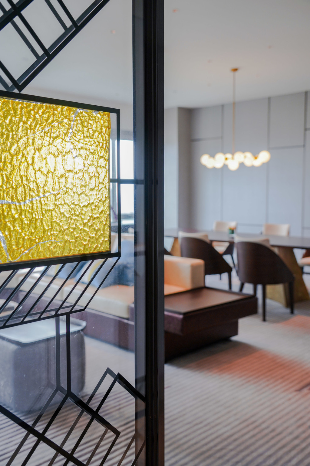 而除了功夫元素,酒店内还充满了岭南元素。倚在格窗边,看着简约的几何形状的雕刻花纹、黄色玻璃上的纹路,让人仿佛回到上世纪的岭南街道,整个格窗的加入,使得酒店更显出一种低调的优雅。