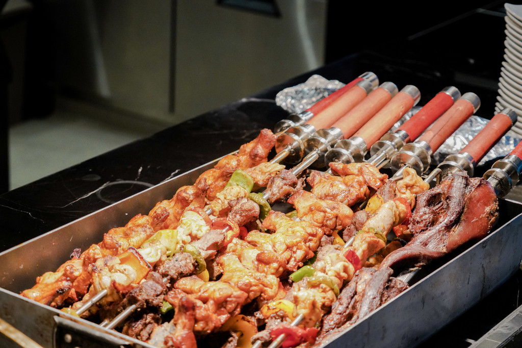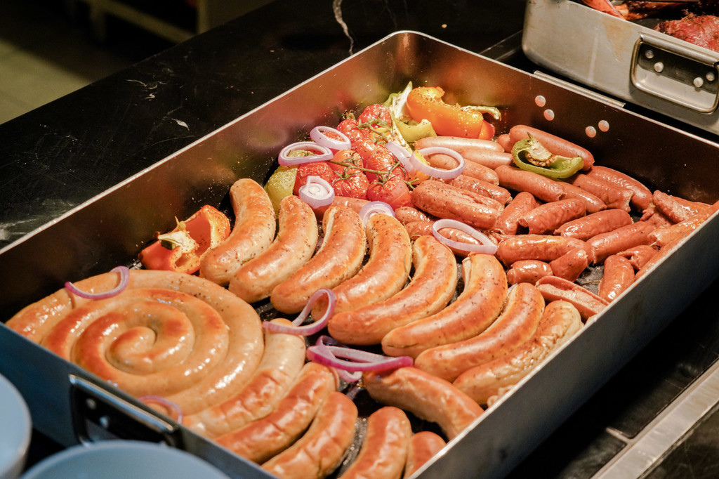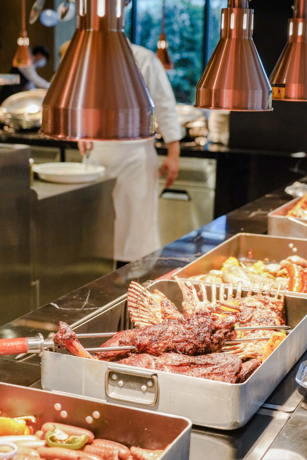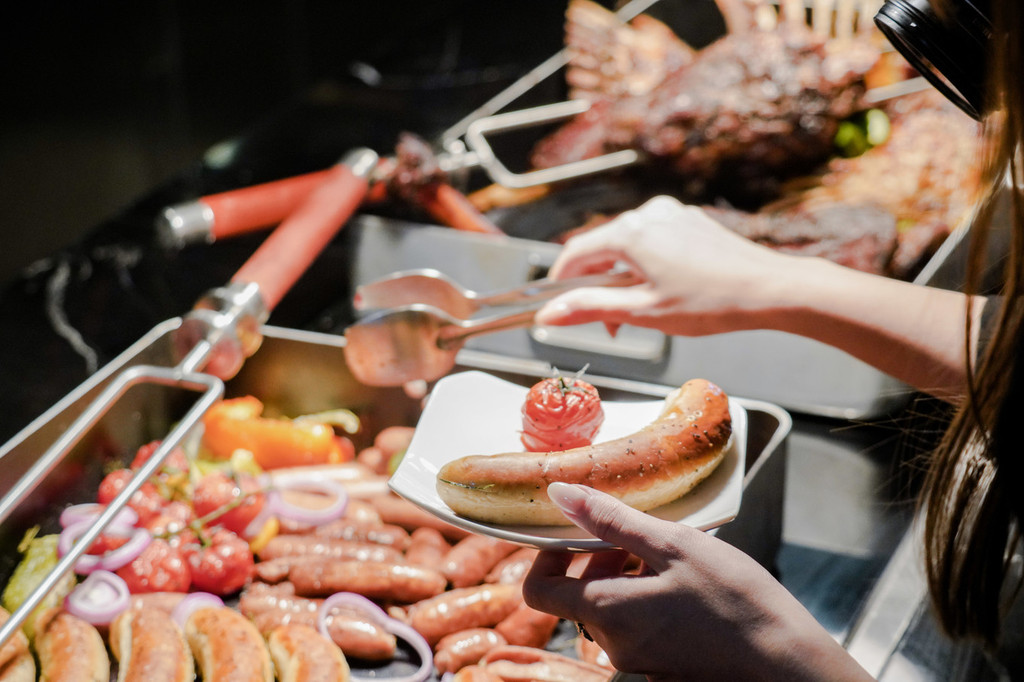 除了海鲜,还有日式菜、 欧陆菜……色泽诱人的德国香肠、现烤现切的牛扒、堪比手臂长的烤肉串……简直是令人眼花缭乱,简直不知道先吃哪一道好。