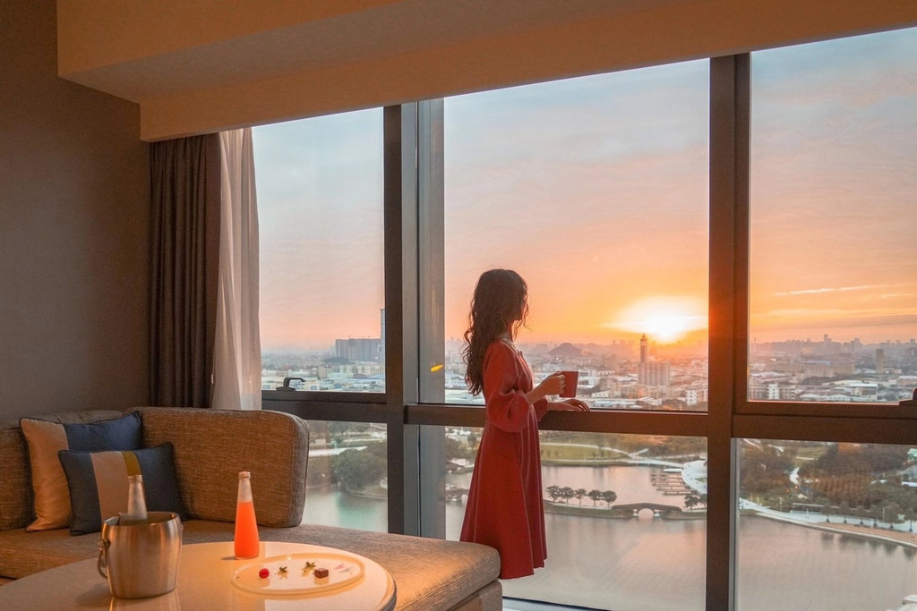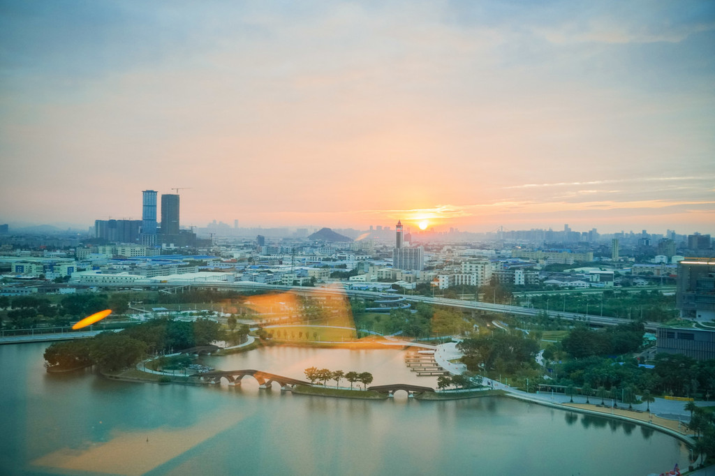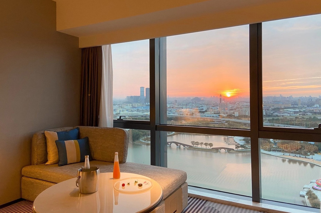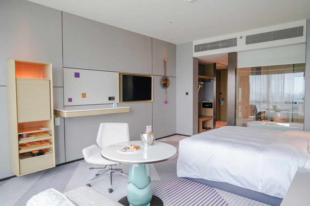 我入住的是21楼的湖景房,整个房间也是以岭南+功夫元素为主题,墙上挂着的比赛铜锣、床头处的窗格,都给人一种满满的岭南式优雅。我超级喜欢这个房间的落地窗,视野非常开阔,窗外就是风色秀丽的文翰湖,还能看到远处的高楼大厦,你以为这就是全部了?不!当夕阳西下时候,更大的惊喜还在等着我!