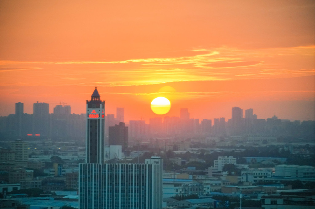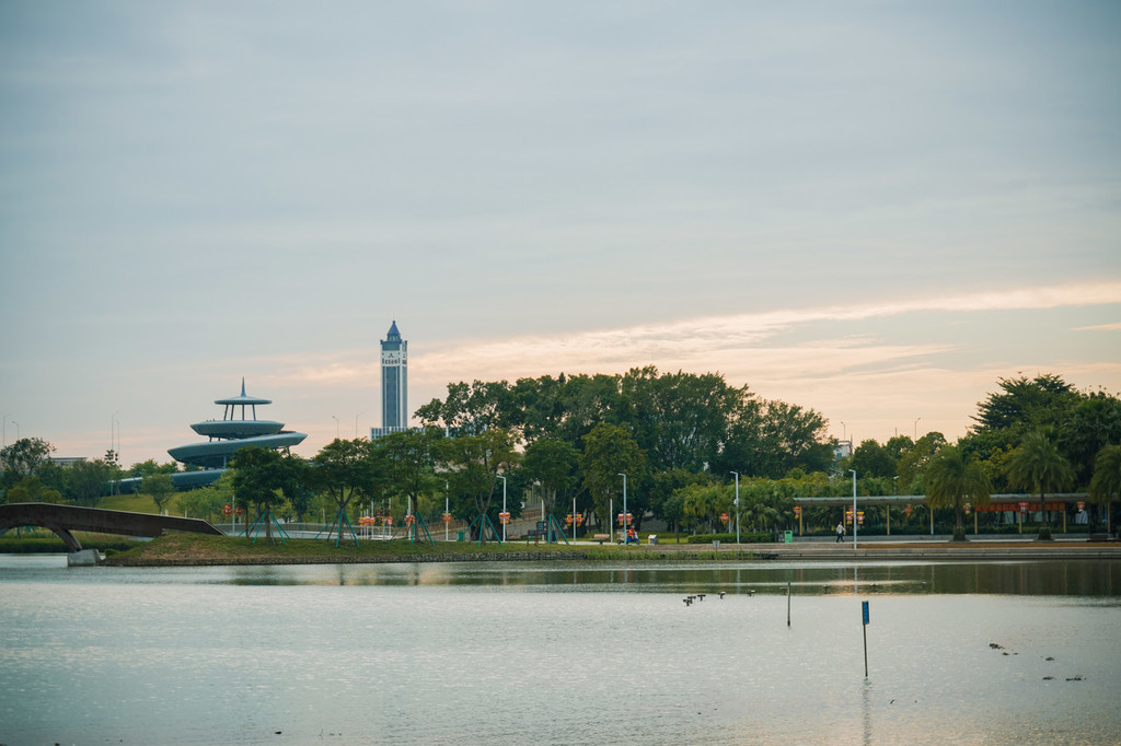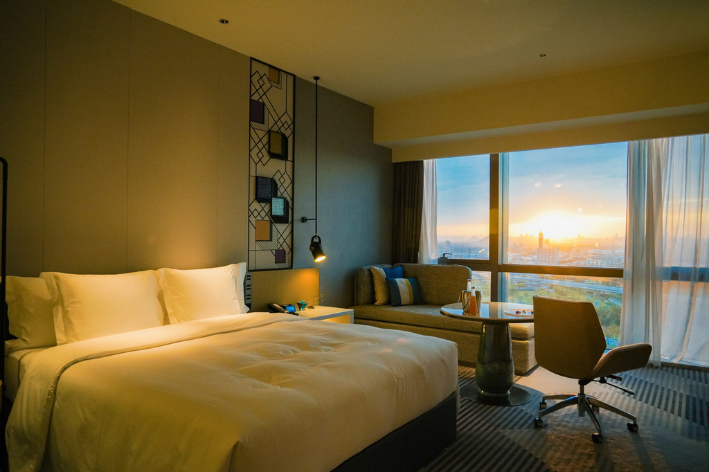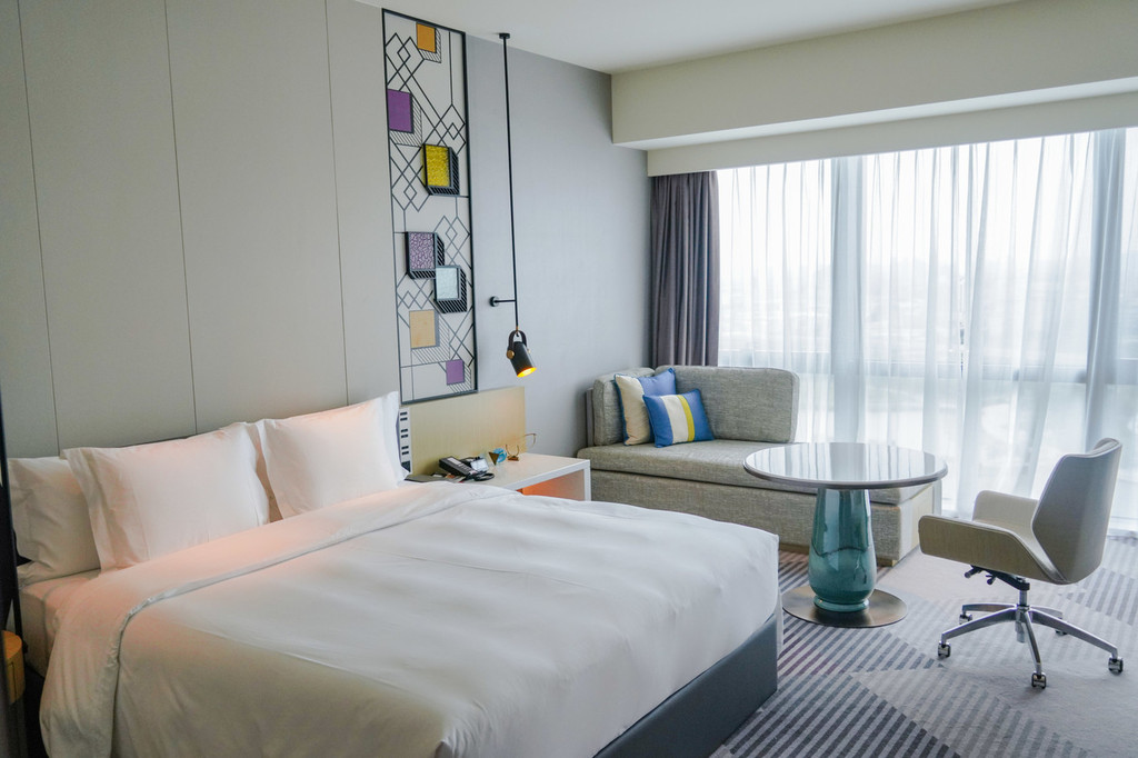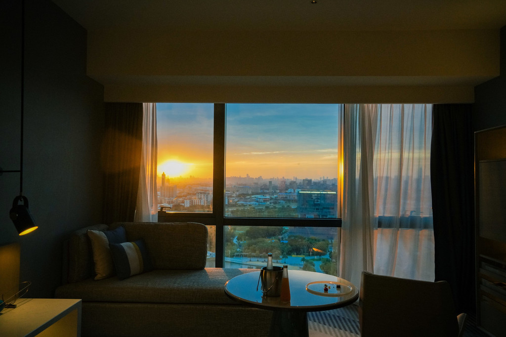 我入住的是21楼的湖景房,整个房间也是以岭南+功夫元素为主题,墙上挂着的比赛铜锣、床头处的窗格,都给人一种满满的岭南式优雅。我超级喜欢这个房间的落地窗,视野非常开阔,窗外就是风色秀丽的文翰湖,还能看到远处的高楼大厦,你以为这就是全部了?不!当夕阳西下时候,更大的惊喜还在等着我!