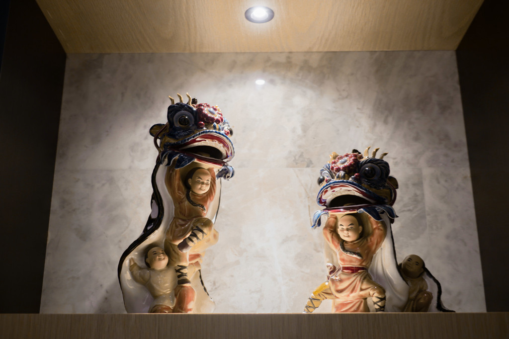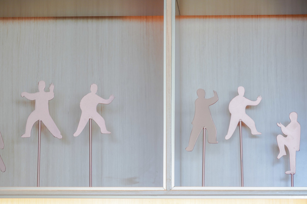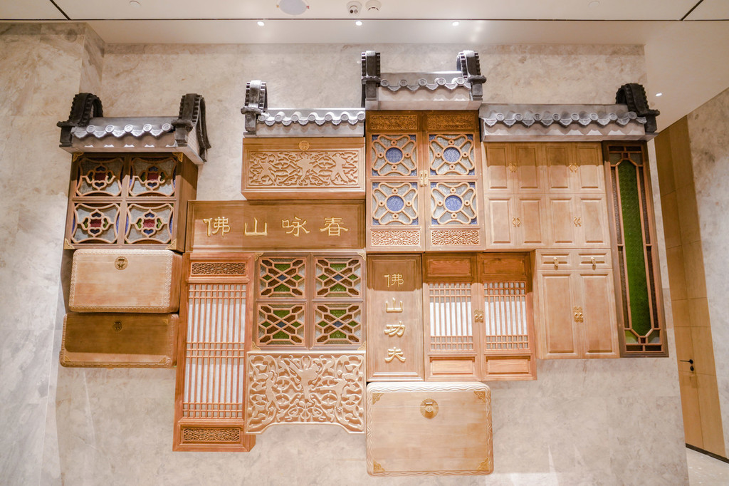 在酒店里,功夫元素真的随处可见,功夫小子的雕塑、醒狮的雕塑等等,1楼及2楼的电梯间,设计师还大手笔将岭南建筑的屋顶和功夫桩规划进来,在这里妥妥能拍出黄飞鸿电影海报般的靓照。