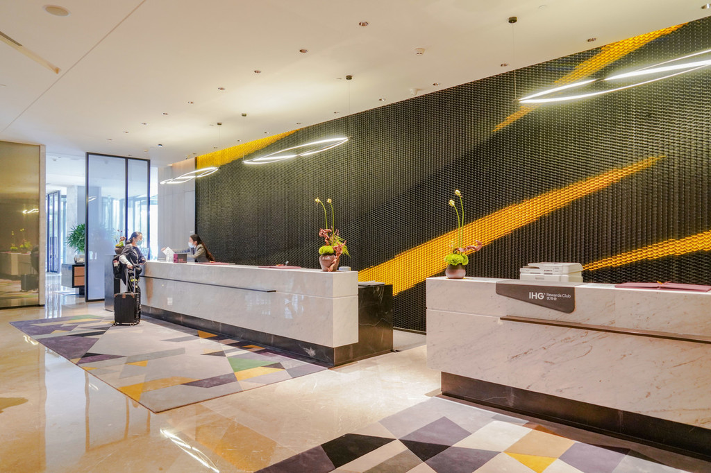酒店的设计融入浓郁岭南气息及功夫元素,抬头就能看到一组由武术棍组成的吊灯,非常有特色。大堂的两侧,还有棍影的抽象派画作,与炫彩LED冰屏明暗交错,皇冠假日的摩登DNA自是不言而喻。