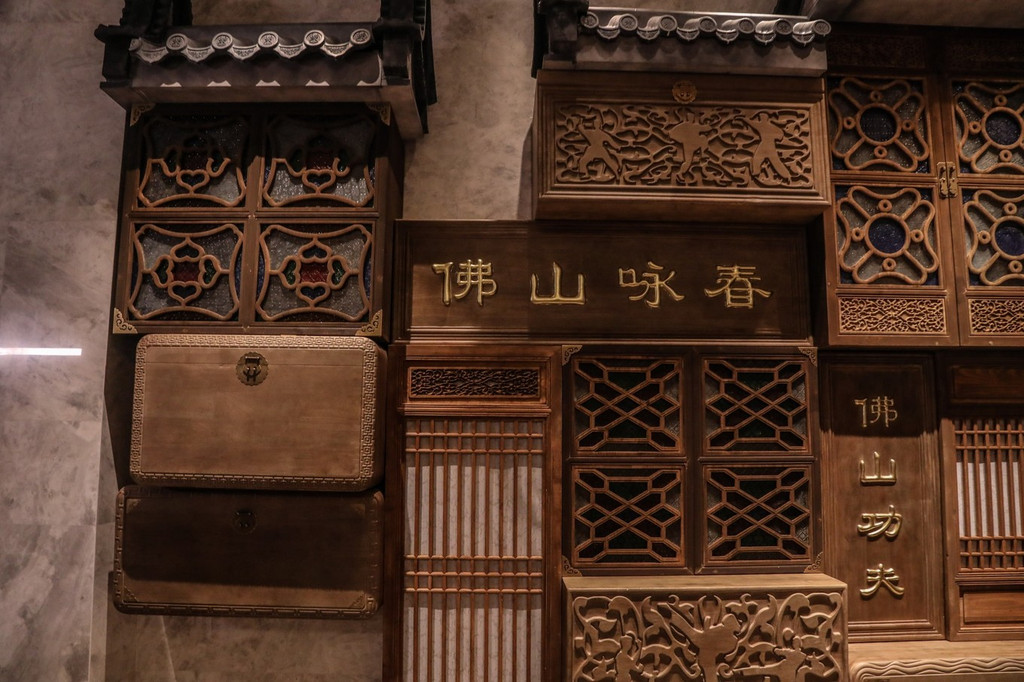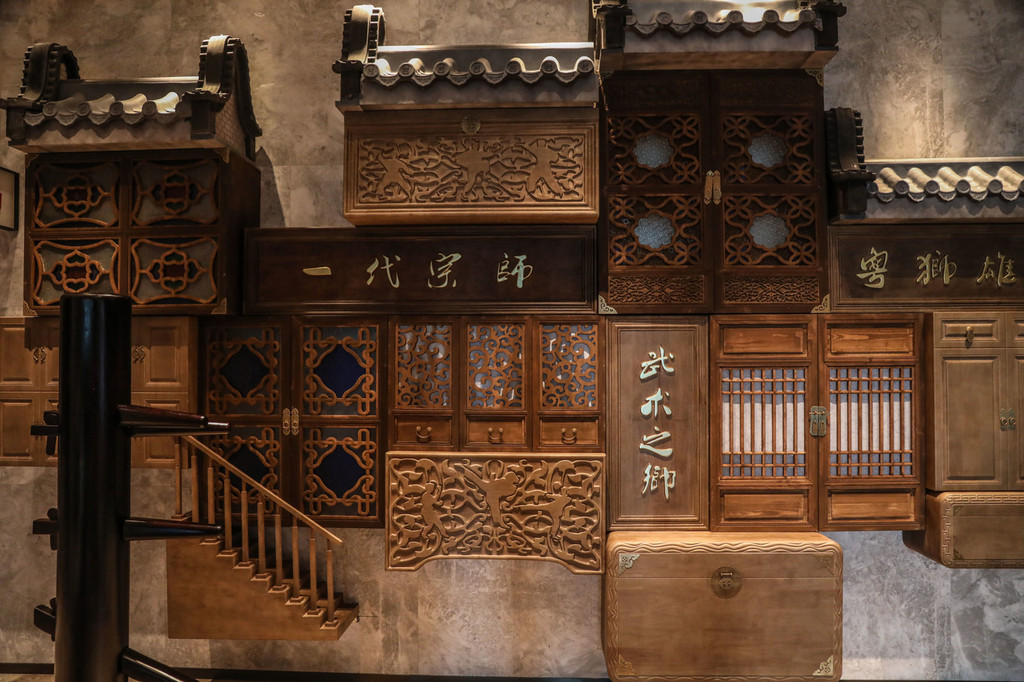 除了武术元素,在这里还能看到很多关于传统文化的缩影。无论是雕花柜子还是彩色窗格,经过了再次设计,被摆放在这里,变成了精致的艺术装饰。