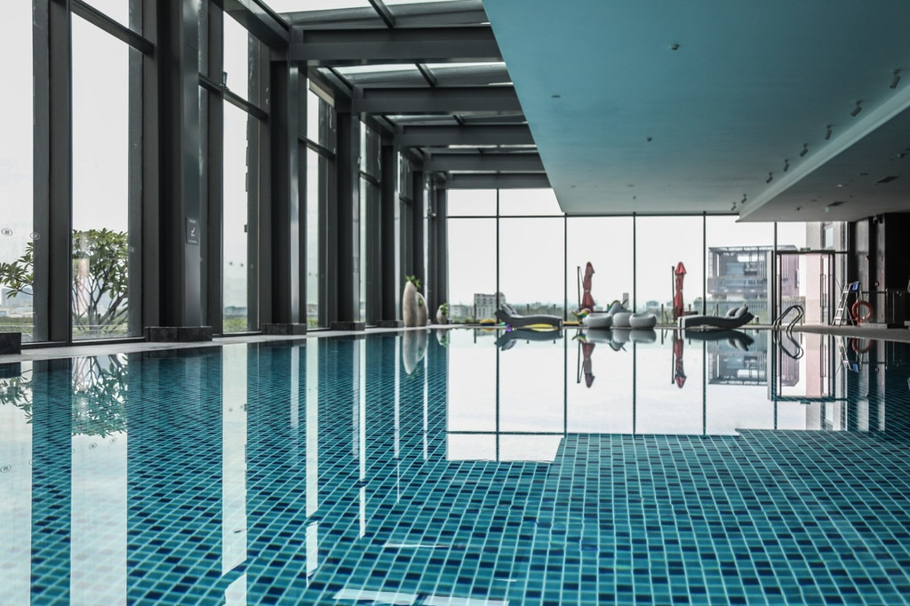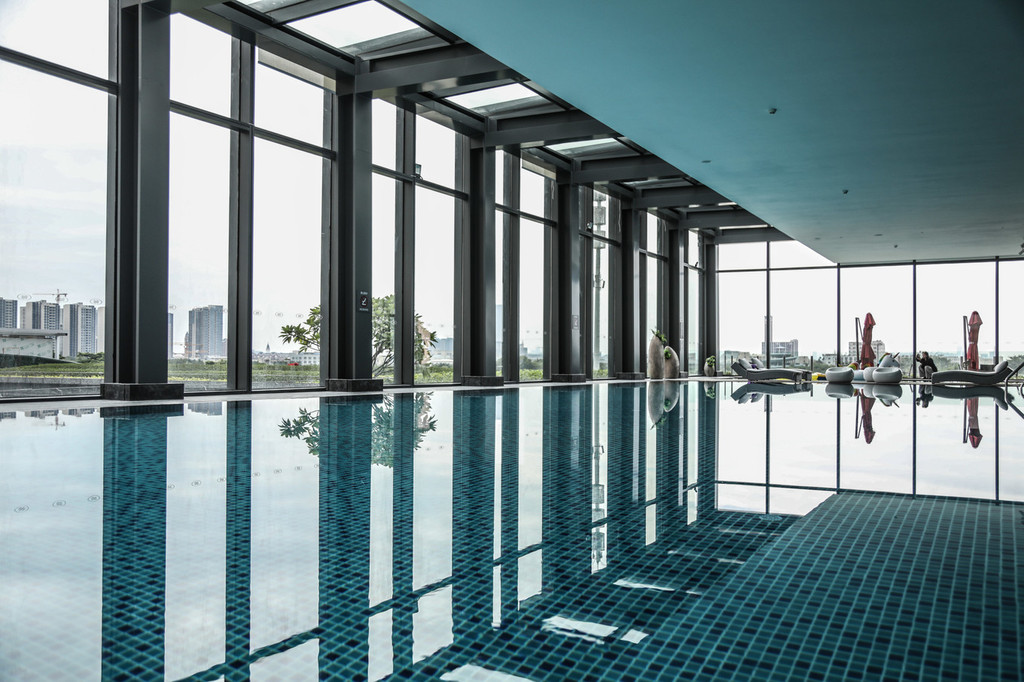 酒店的泳池是室内恒温泳池,采用了落地玻璃的设计,在畅泳的同时还能看到户外的美景。