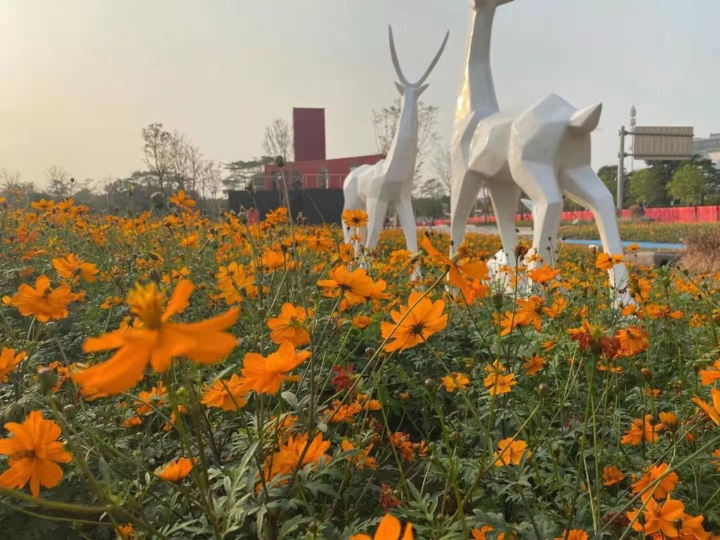广东 的冬天很温暖,大片金黄色的波斯菊已然盛放,烂漫的花海与蓝天白云构成一幅色彩缤纷的画卷。