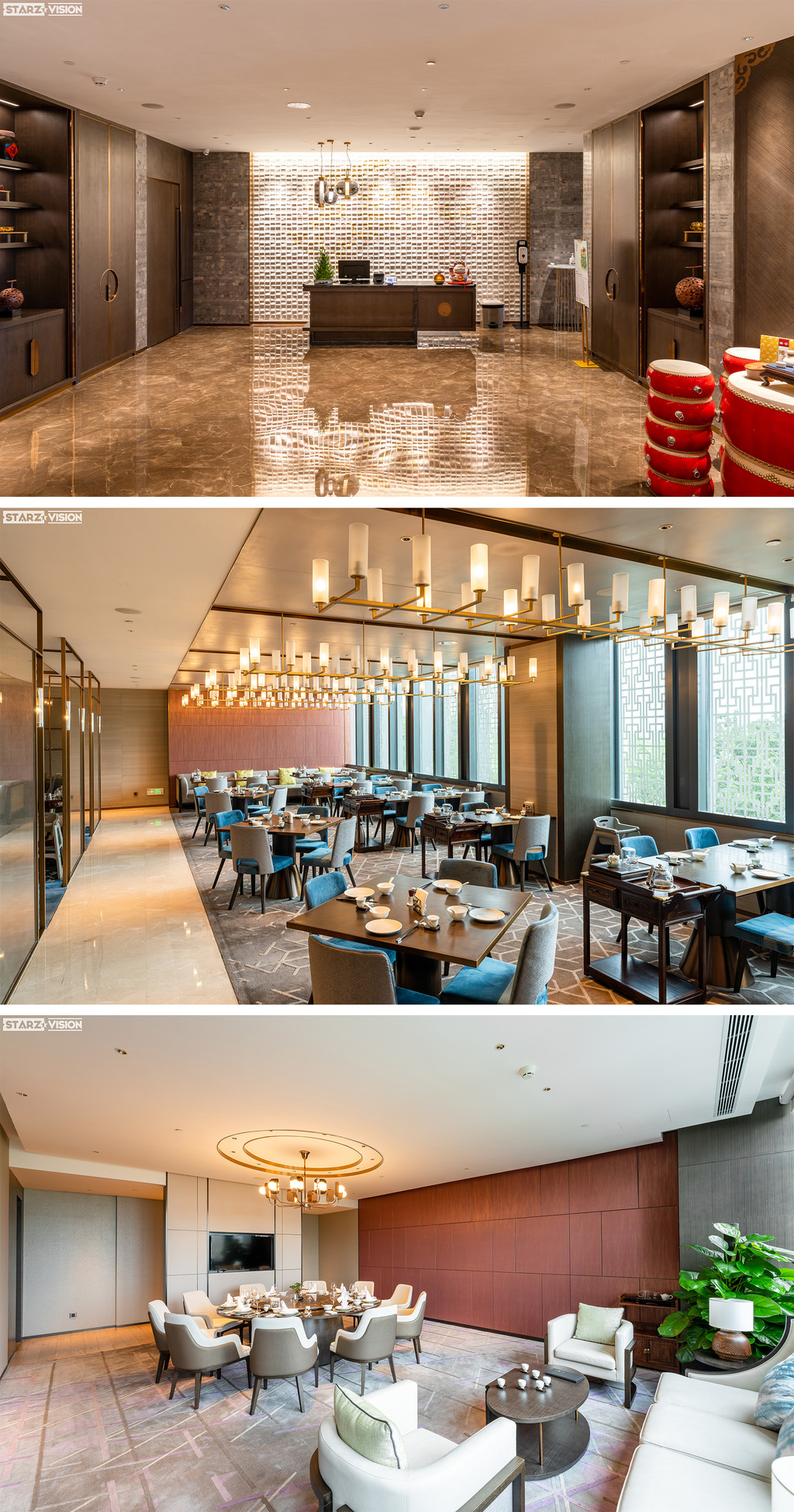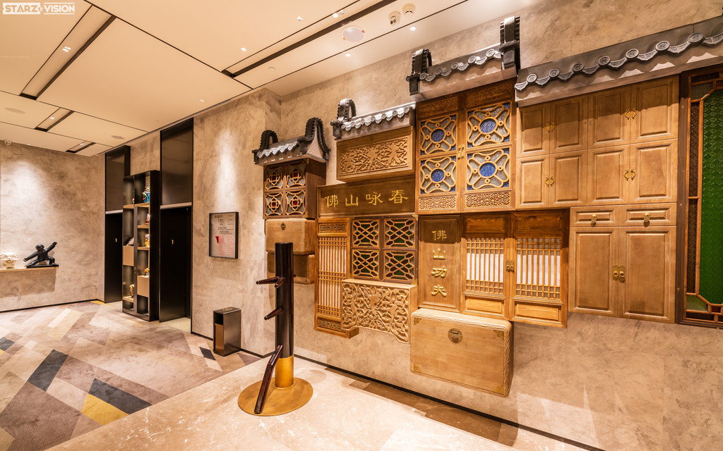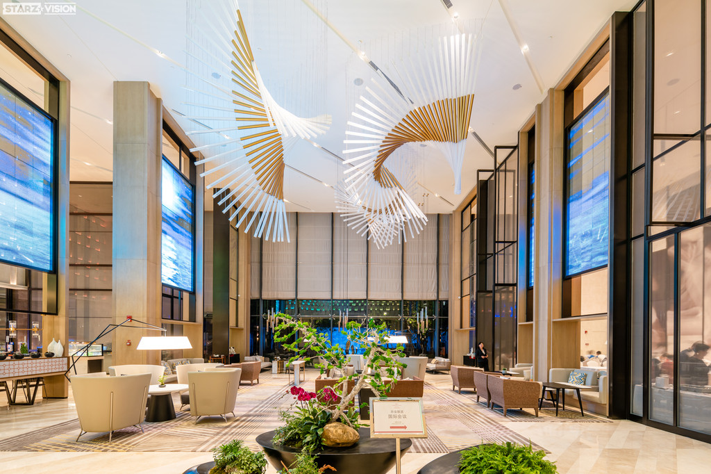 酒店大堂简约时尚,辅以浓郁的岭南文化元素设计,显得独具一格。天花上的灯饰,是源于武术中的“棍花”造型而设,彰显着佛山武术文化特色,令人印象深刻。位于大堂后方的中庭花园中,装点着佛山的市花“白玉兰”的摆设,两旁配以岭南建筑风格中的彩色窗格点缀,一派岭南风韵,别出心裁。