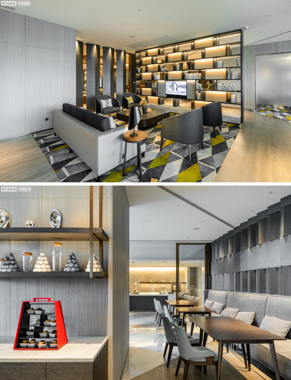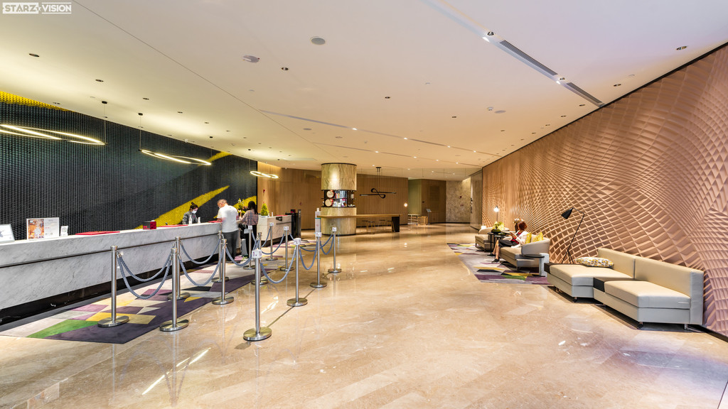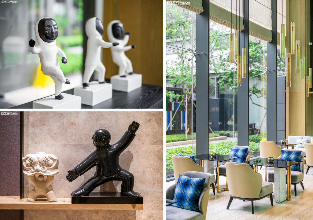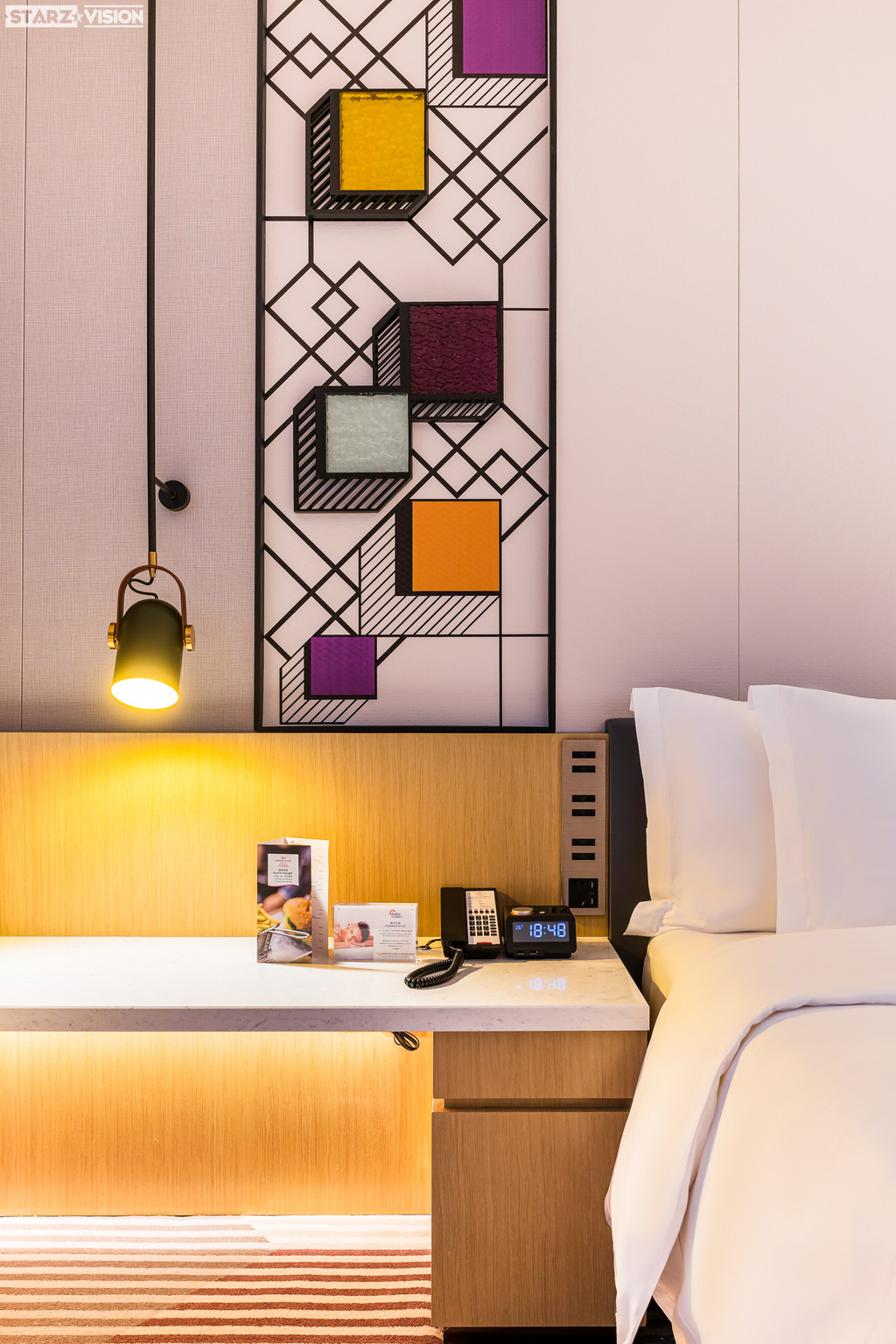 酒店大堂简约时尚,辅以浓郁的岭南文化元素设计,显得独具一格。天花上的灯饰,是源于武术中的“棍花”造型而设,彰显着佛山武术文化特色,令人印象深刻。位于大堂后方的中庭花园中,装点着佛山的市花“白玉兰”的摆设,两旁配以岭南建筑风格中的彩色窗格点缀,一派岭南风韵,别出心裁。