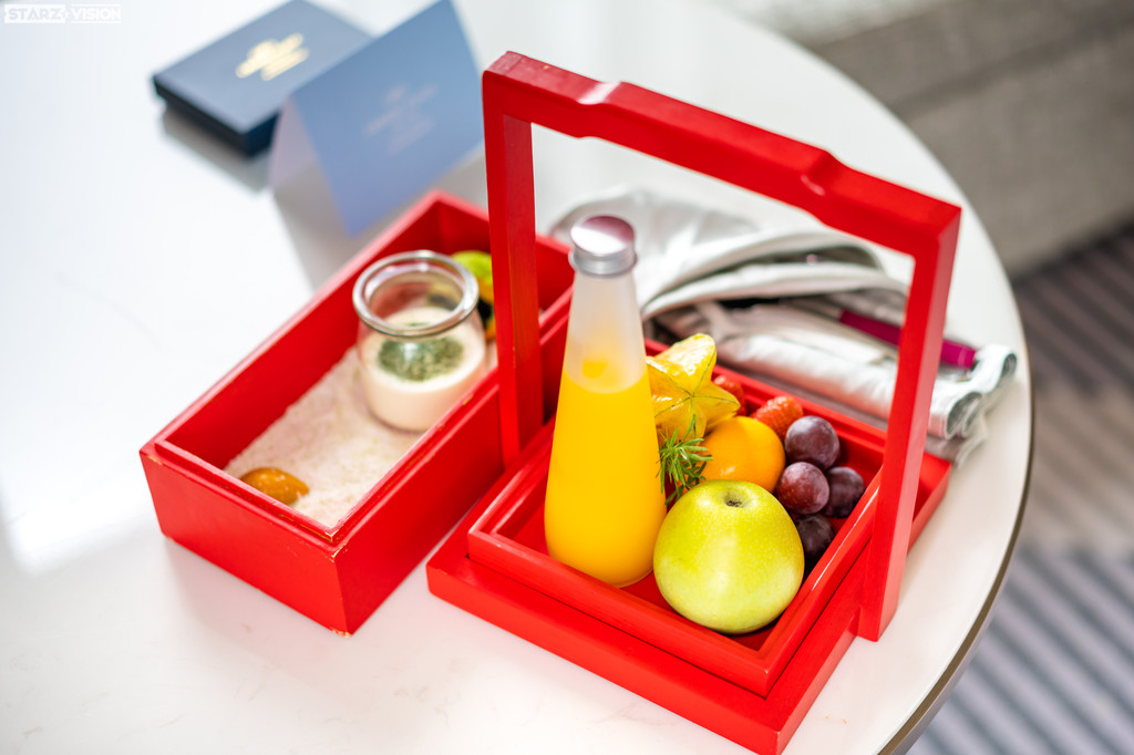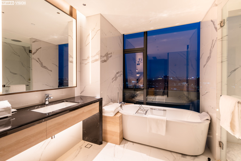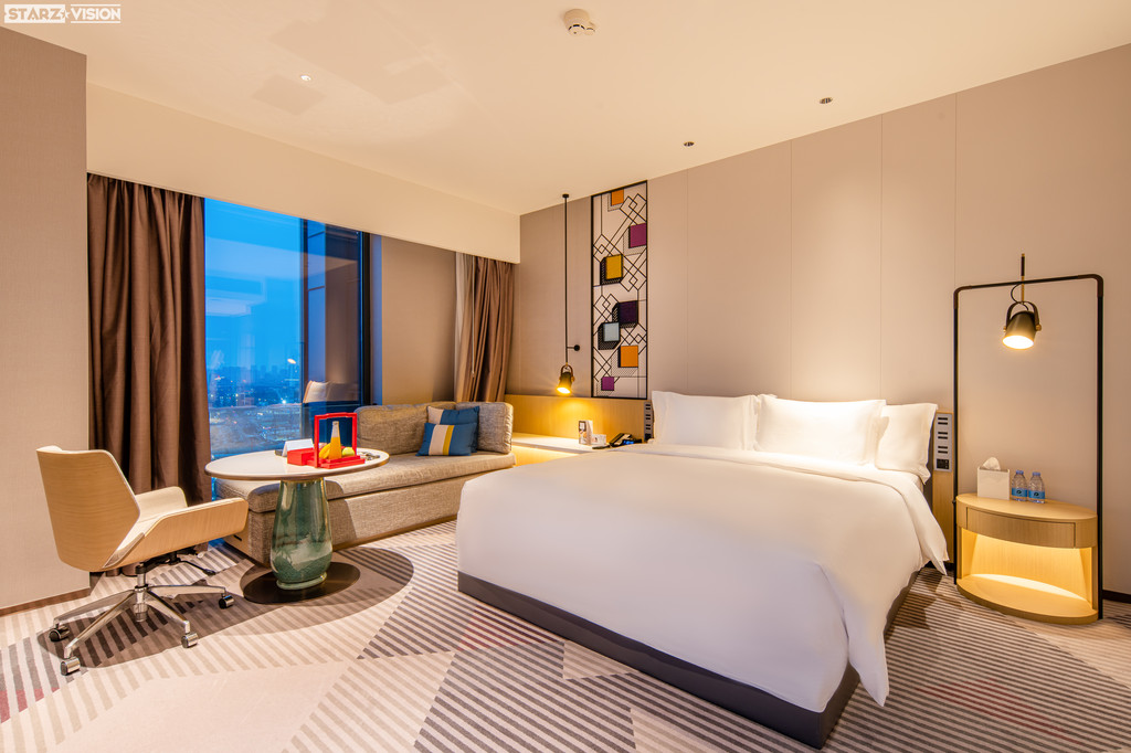 308间拥有开阔视野的全景落地窗客房,临湖亲水,景色精致迷人。房间采用了现代简约风格,融入了岭南风格建筑中的彩色窗格的设计元素,与酒店主题相得益彰。卫生间宽敞开阔,并配以独立淋浴及浴缸,可以能一边泡澡一边欣赏窗外文翰湖的风光。房间内的一份精致点心和果品彰显着酒店对宾客的无微不至的照顾,让每一位宾客都感受到如家般的舒适。