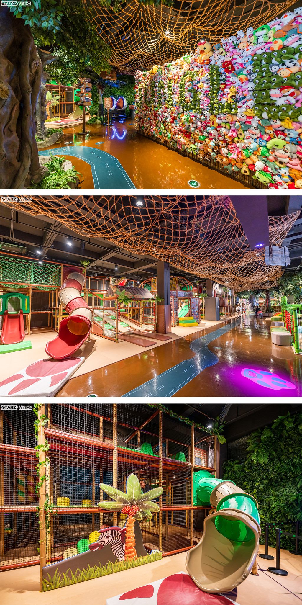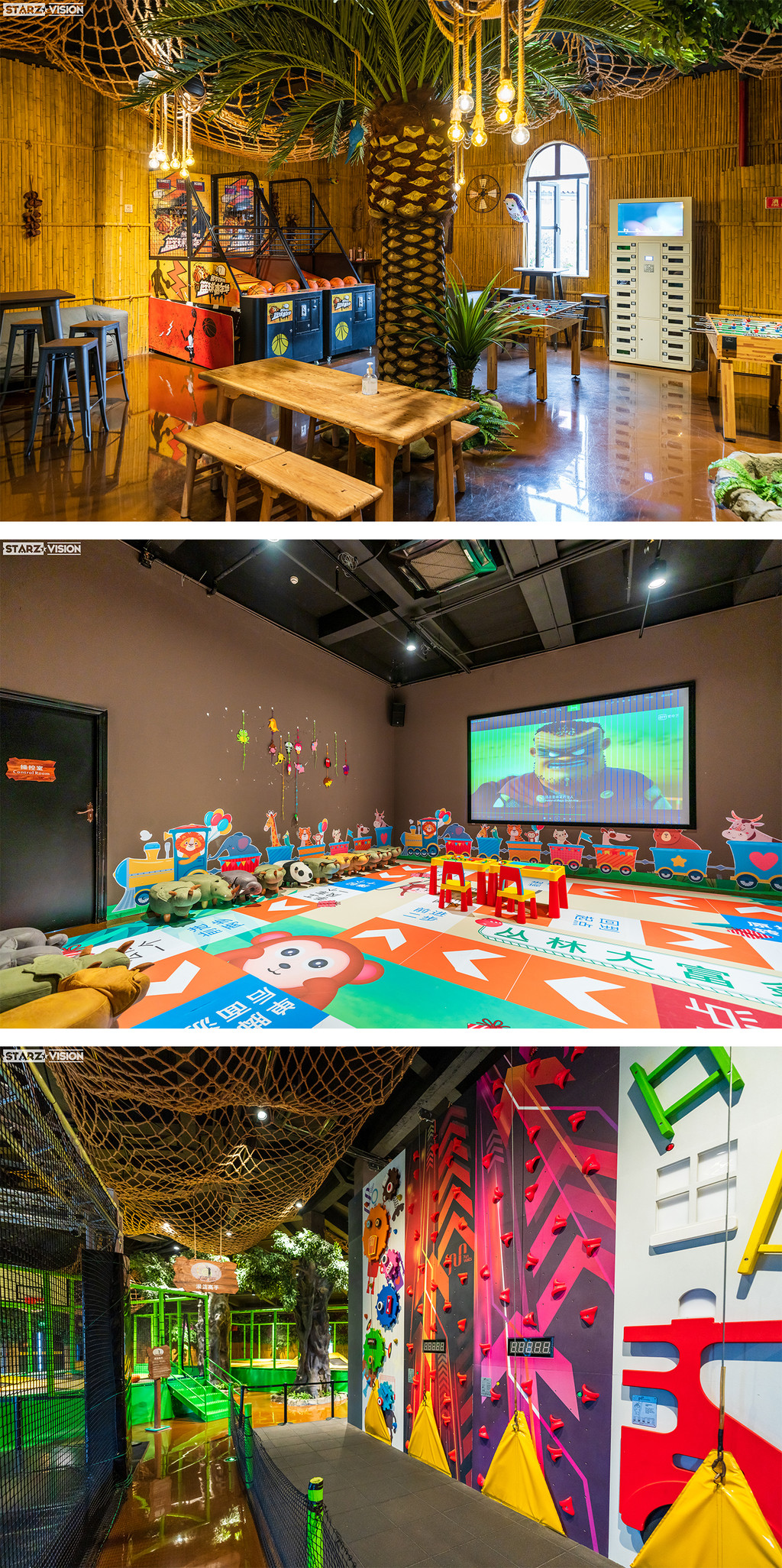 两层的空间内包括了丛林探险、儿童娱乐及VR体验三大区域。不仅有经典的弹簧蹦床、攀岩、动感影院等娱乐项目,还有“丛林游乐场”、“勇者之路”、“极限徒步”、“镭影丛丛”等探索游戏。