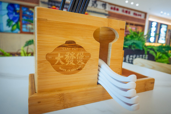 来到这里细心的朋友能够发现,好像这里到处都印有大大小小的大发煲的logo,就连餐桌上放勺子的木盒子都不例外。
