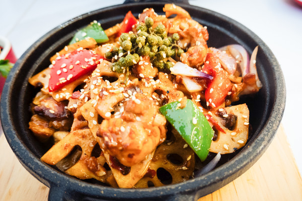 接下来便是主食了,首先就是一份麻酱焗牛蛙煲,一株大大的新鲜花椒点缀在牛蛙煲的上面,加上几片新鲜的红色辣椒,再来一些脆脆的藕片,这道菜让人看上去就很有食欲,并且四川风味十足。