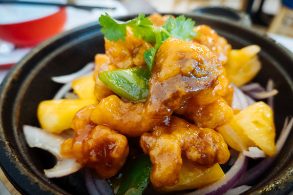 第二道菜就是最具特色的菜了,这道名为菠萝咕噜肉的菜,酸酸甜甜又带有菠萝的清香,先吃一块香酥可口的咕噜肉,再配一口菠萝,真的是好吃又不腻。