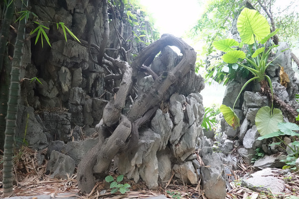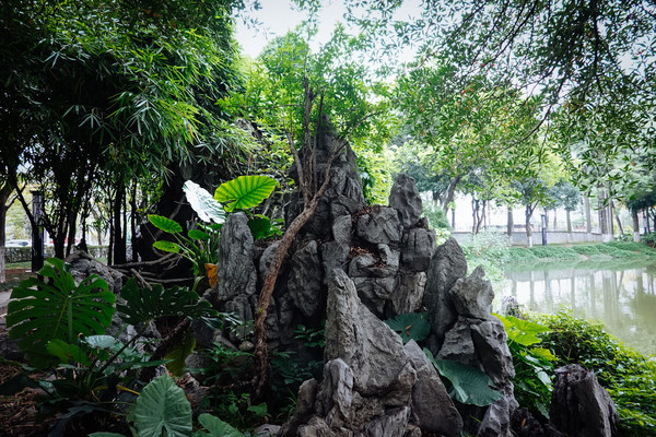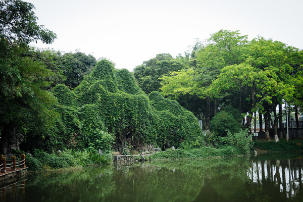 假山的山上甚至爬满了某种藤蔓植物,从外表看上去就好像绿油油的真的是一座山一样,