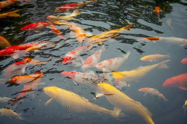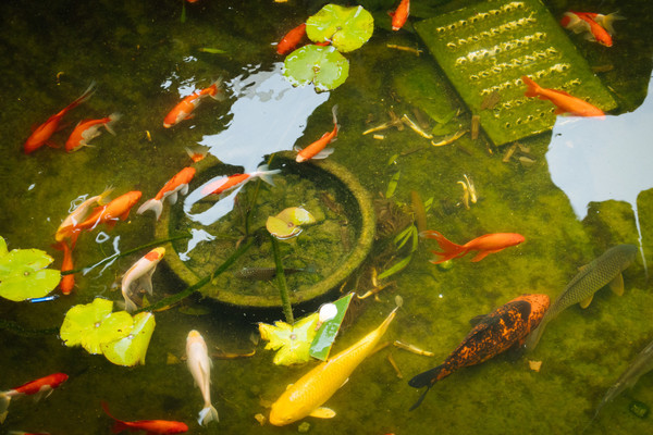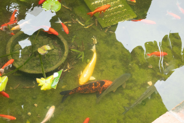 在酒楼大门的左侧,有一个非常精巧的池塘,正好碰见保安在喂鱼,手里抓着一把玉米往鱼池里撒去,这些雨便欢快的在水面进食。