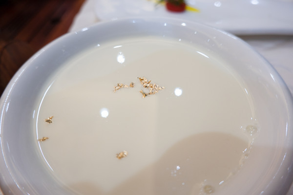 金箔姜撞奶,面上漂着些许金箔,特别漂亮.