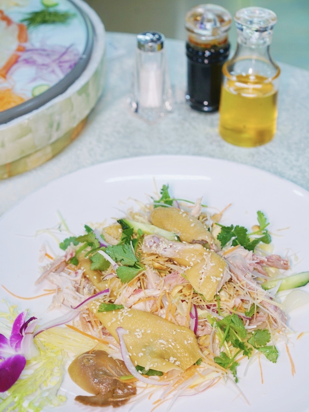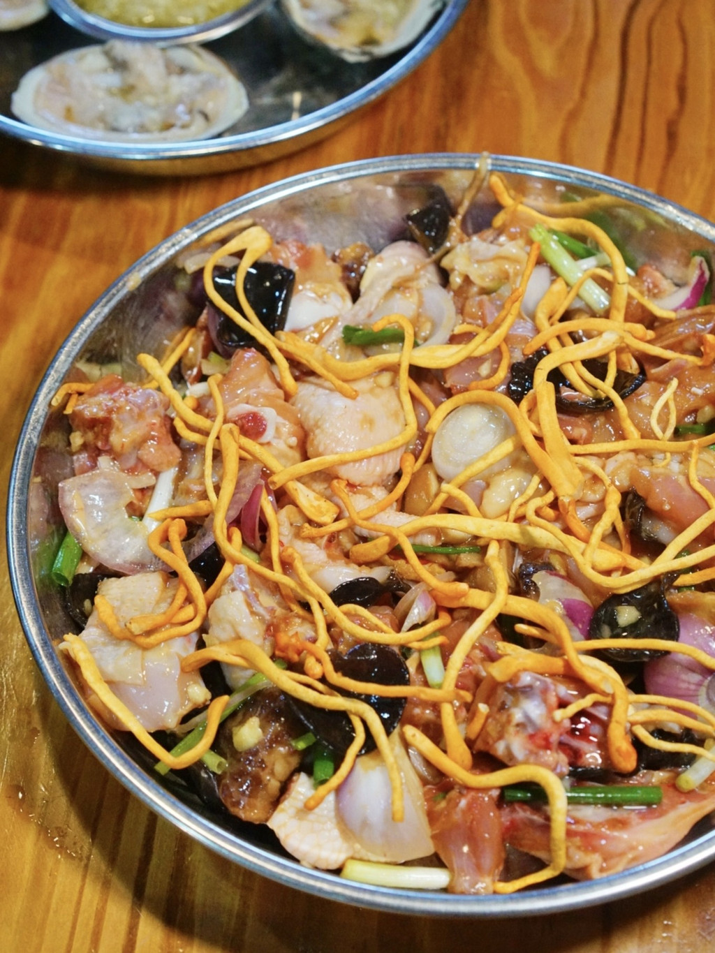 桑拿鸡推荐选择养足200天的大扇鸡,加上木耳、满满的虫草花提鲜,一起清蒸,鸡肉会带上淡淡的清香。鸡肉肥瘦适中,鸡皮爽滑,鸡肉爽嫩,满嘴都是甘香的鸡味。