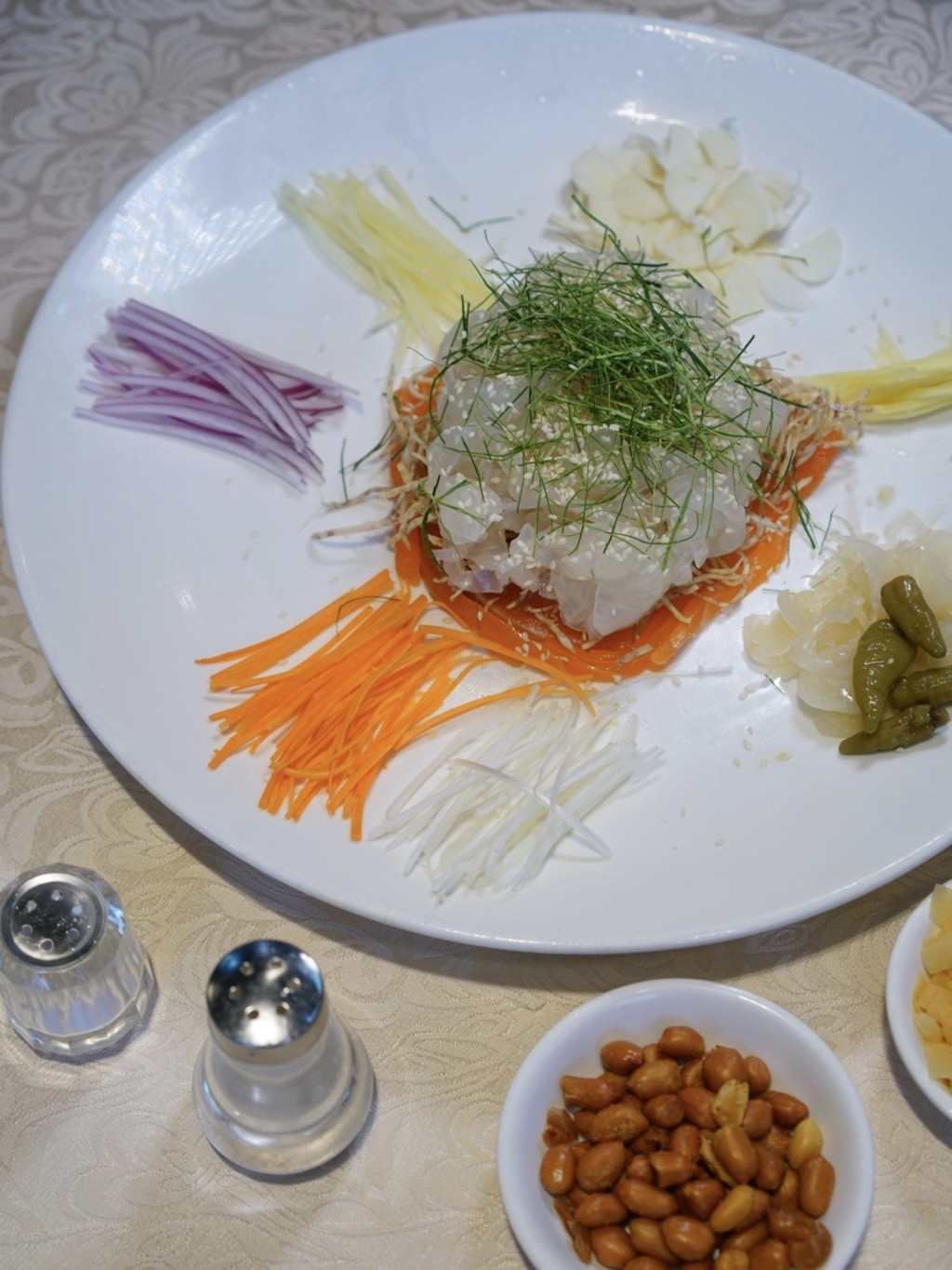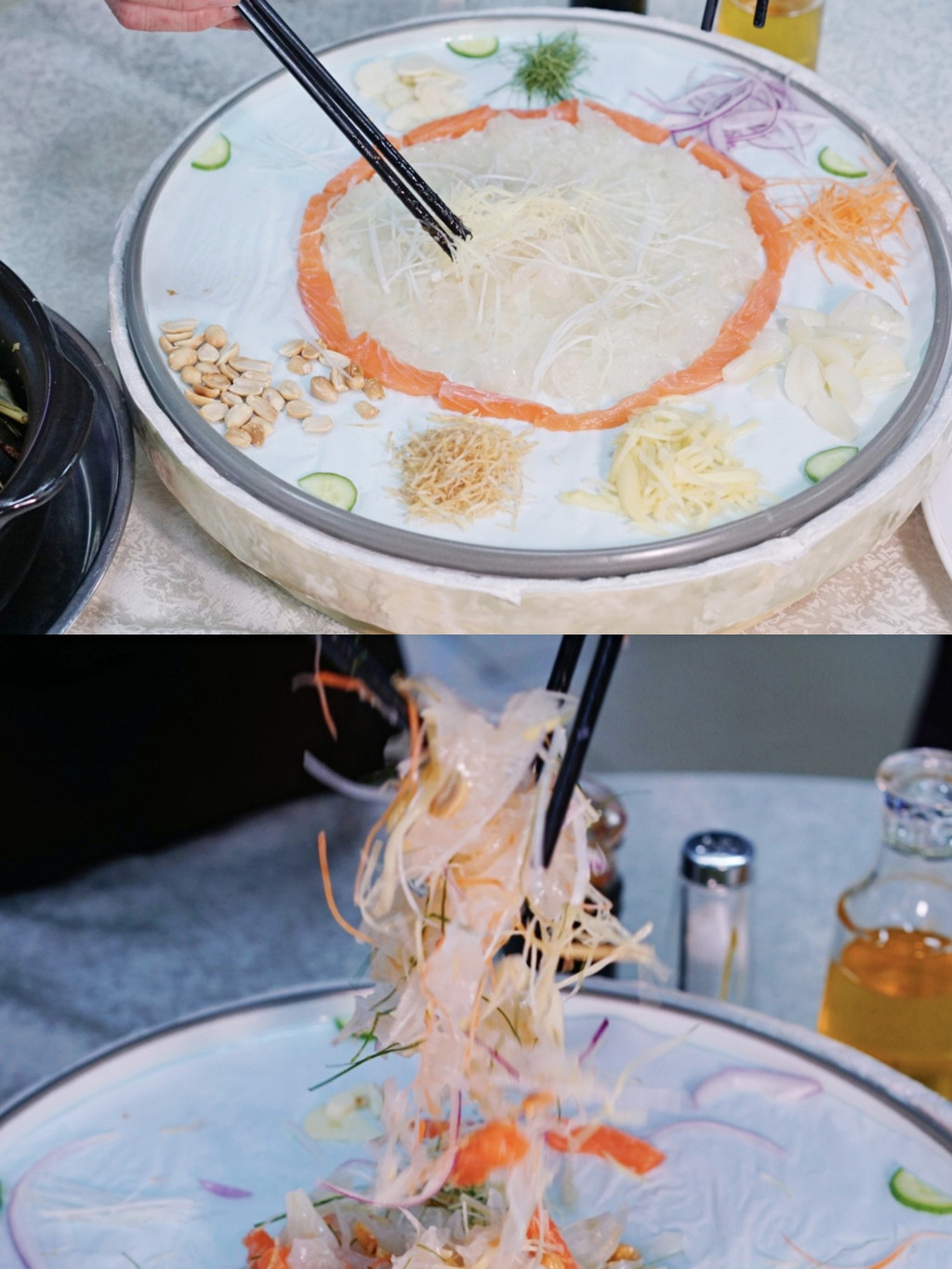 【风生水起】 顺德 名菜。把切好的皖鱼的生鱼片加花生油与各种配料小菜拌在一起吃。口味清淡,搭配着花生,吃起来口感丰富,有姜丝的辛辣,也有甜蒜的滋味,把生鱼片拌入其中,入口滑嫩,满口溢香, 顺德 鱼生就有着让人欲罢不能的吸引!