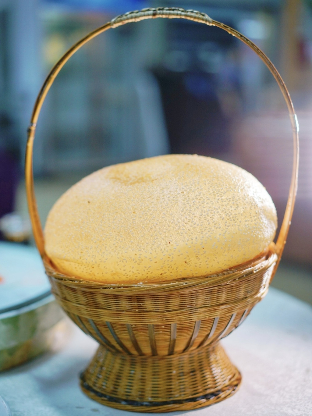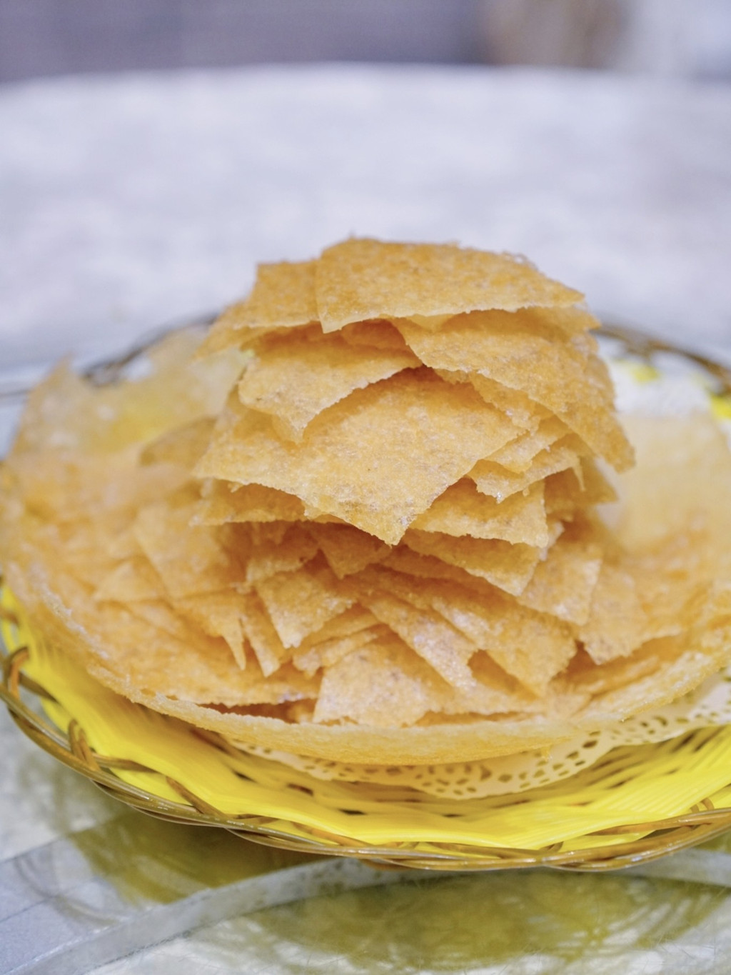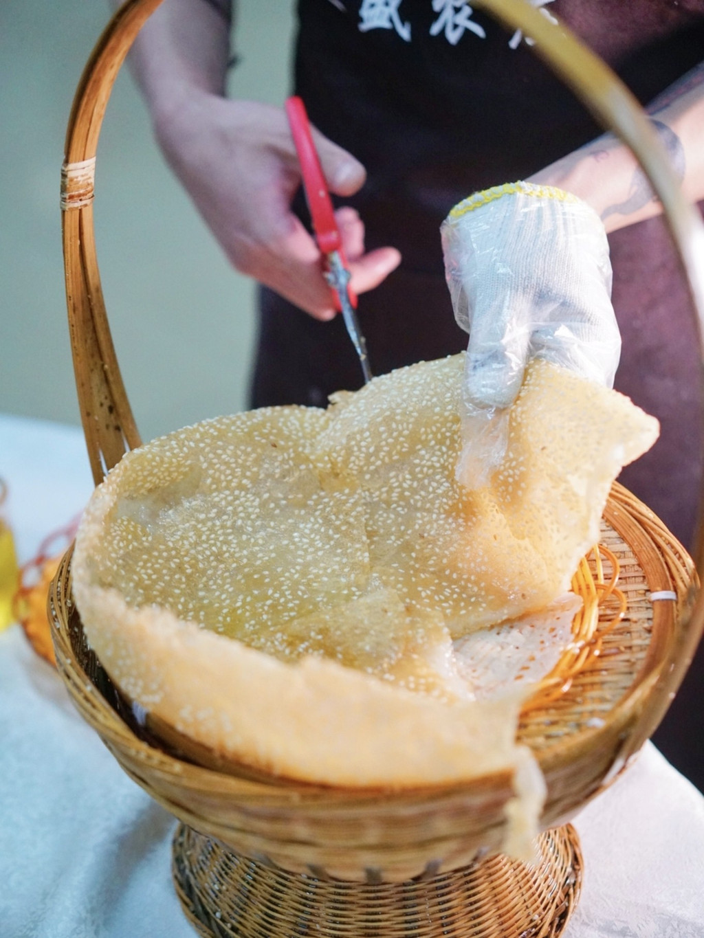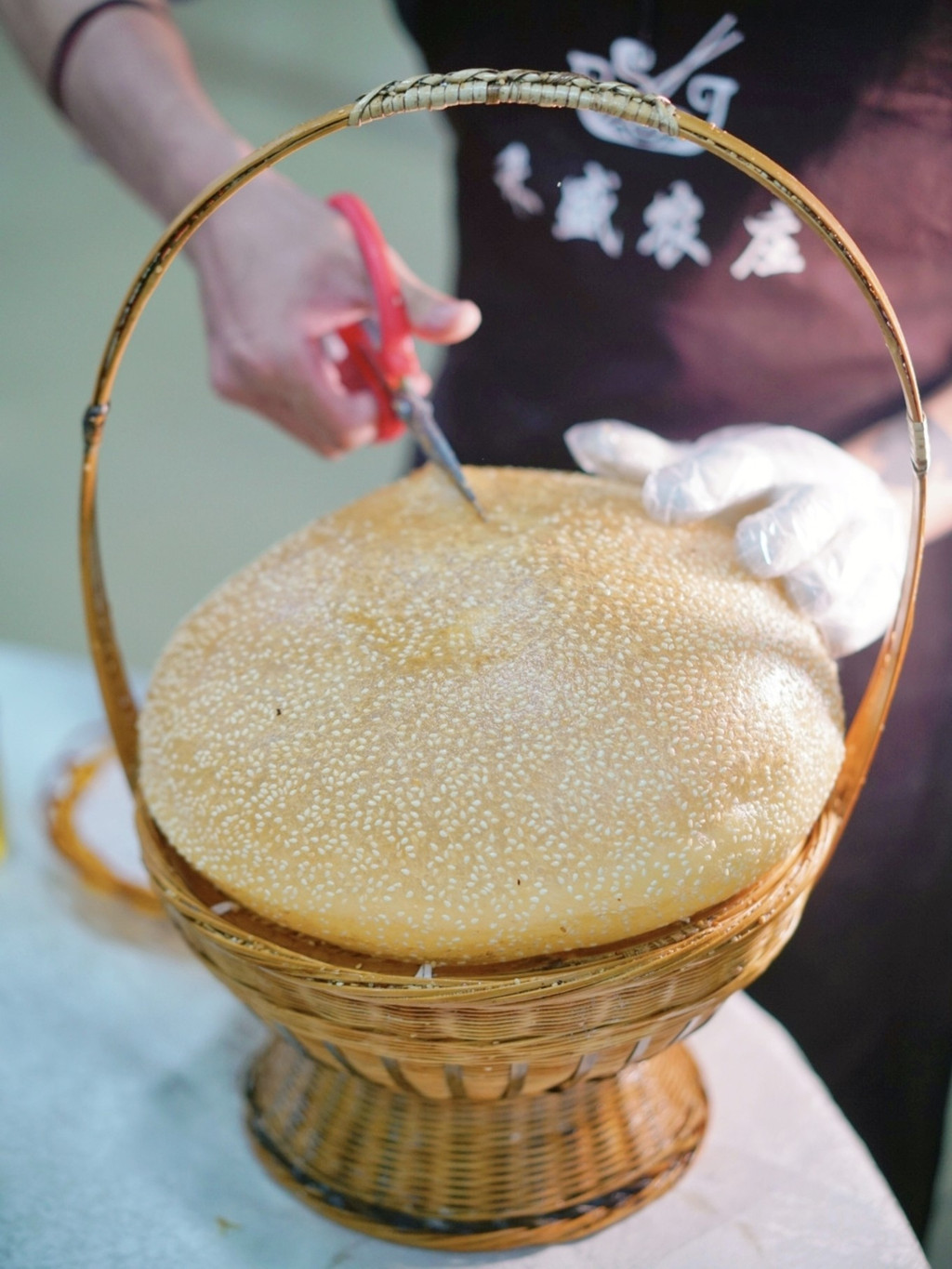 始制于明代 广东顺德 龙江镇,以糯米粉揉合粘米粉碾作皮,以爆谷花与炸花生加糖浆拌均作馅,捏成球状,大若拳头,表成辘满芝麻,下油锅炸至金黄色即成。食味松脆甘香,长期风行粤港澳地区。现在的煎堆已经是简化版,又做得好看又抢眼!禾盛的煎堆简直让我惊喜,带着传统的竹篮上场,一下子把所有的目光吸引过去!又好吃又香~是从小都难以忘记的味道呀!