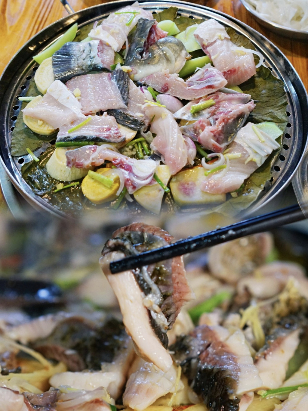 这道菜严重推荐,厨师会应顾客要求可以展示制作过程,鹅卵石烧热垫锅底,陈年花雕酒在盖锅时淋上,鱼香带着酒香,将味道发挥到极致!