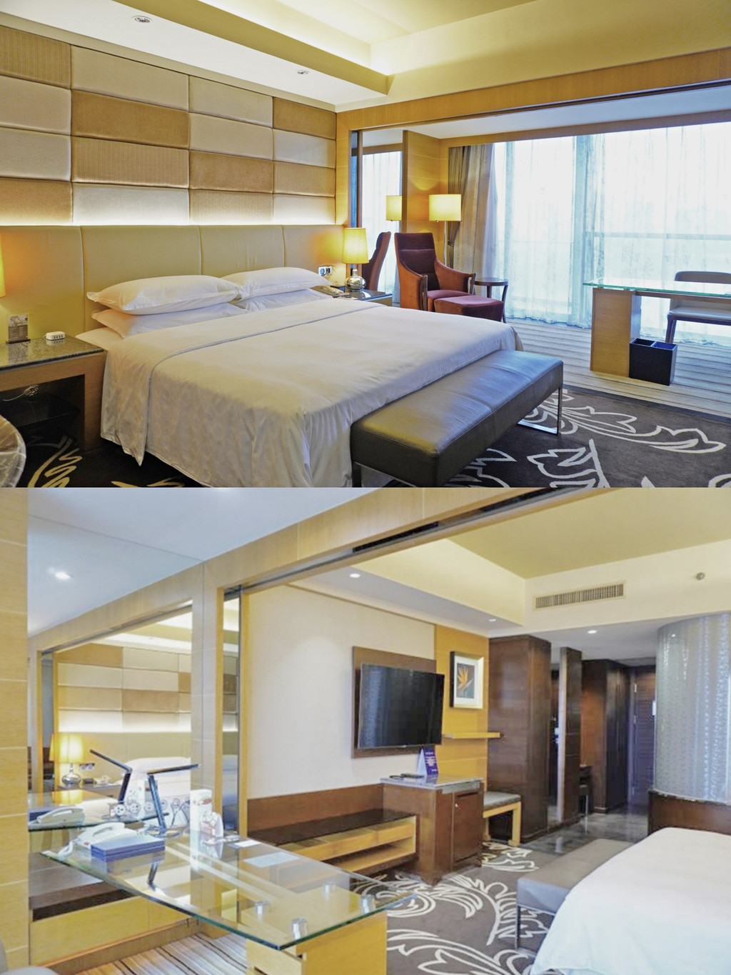 酒店客房宽敞舒适,这次入住豪华江景房,带独立阳台,可远眺城市景观和德胜河美景。洗手间干湿分离,带有浴缸。