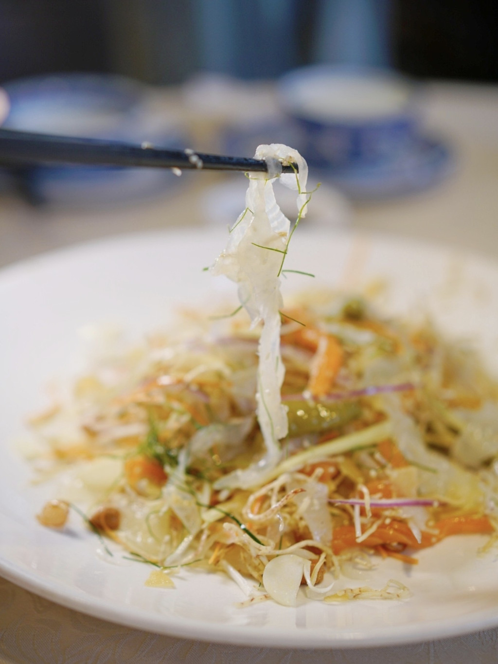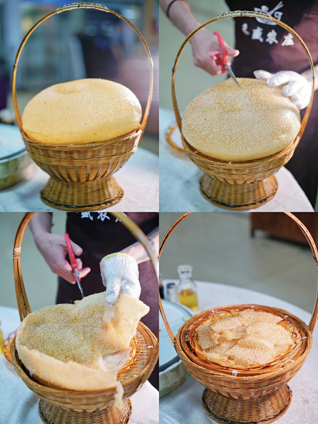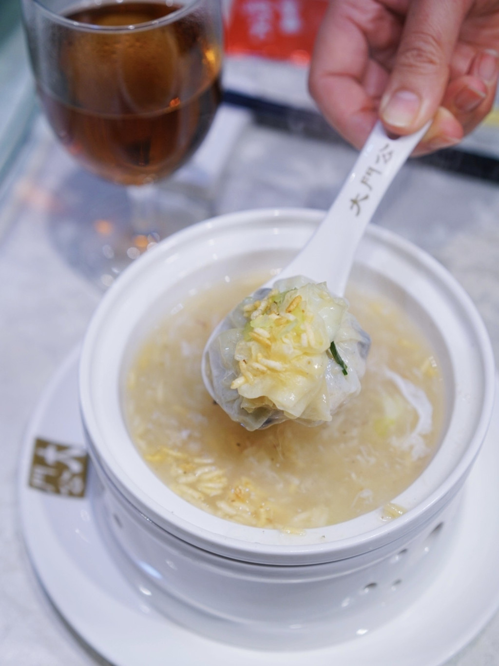拆鱼羹作为 顺德 “一鱼八味”的头菜,是当地历史悠久的传统家常汤品。它的主料是鱼肉,将鱼煎香之后拆出鱼骨做成鱼蓉,然后把鱼骨熬汤,加入鱼蓉、胜瓜丝、腐皮丝等配料,最后勾上薄芡。这道菜也有“ 顺德 七彩拆鱼羹”的美名,是 顺德 菜粗料精作的充分体现。而大公门的做法是将材料都包裹起来,撒上脆米,口感浓郁的鱼汤,带着鱼羹的特有香气,不会腥气,十分创意又特别!满足了我爱喝汤的心思~