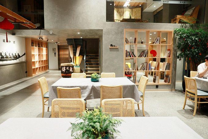这是龙归里一层的陈设,顶上挂着一个长长的龙舟,吧台后边是厨房,在这里可以点咖啡,早餐也是在这里,相当有氛围了,看小姐姐在那里做咖啡,真的是赏心悦目。
