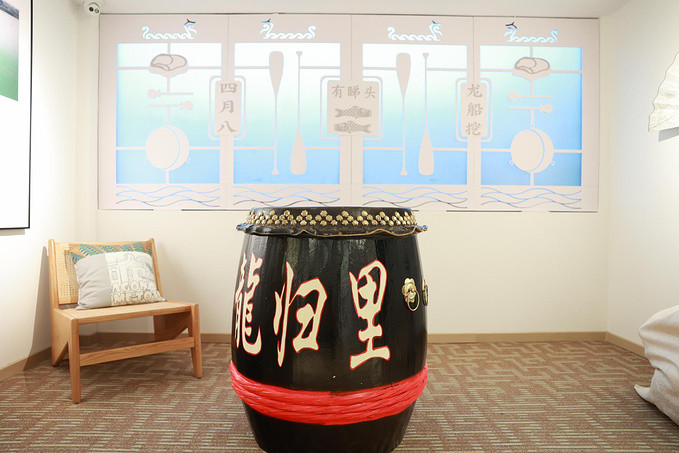 这是民宿大堂里的一幅立体壁画,黑色的浮雕白墙底,展示了生动的划龙舟景象。