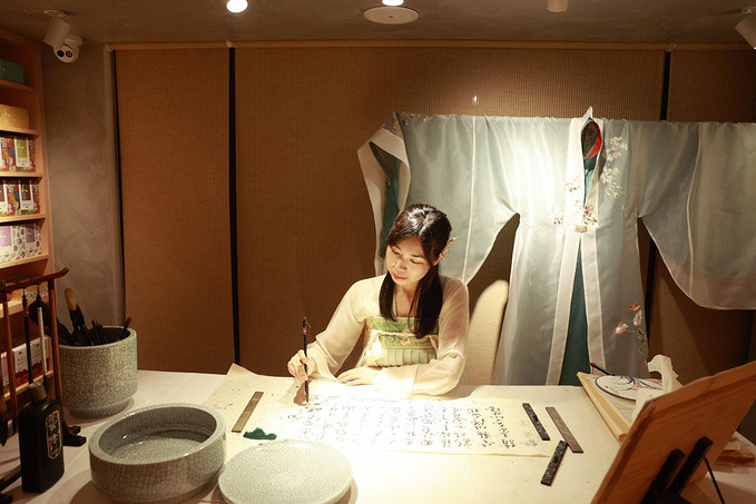 夹层的汉服体验区,这里有张书法桌,可以写毛笔字,或者静静的抄经书,可以让内心更加的平静