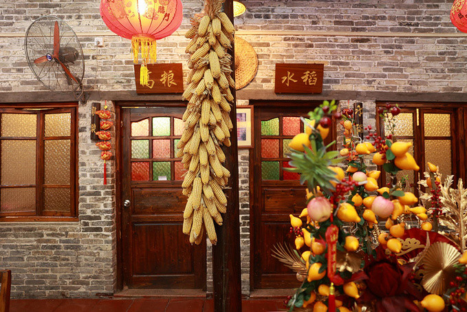 去餐厅吃饭,一个漂亮的有特色的环境,更能让人心情愉悦,这里就感觉不错哟,青砖砌墙,红灯笼装饰,这里那里挂几串玉米,加上暖暖的灯光,氛围感马上就来了。