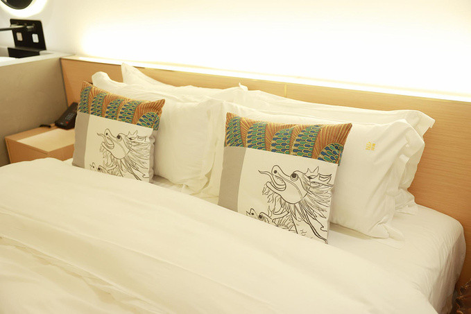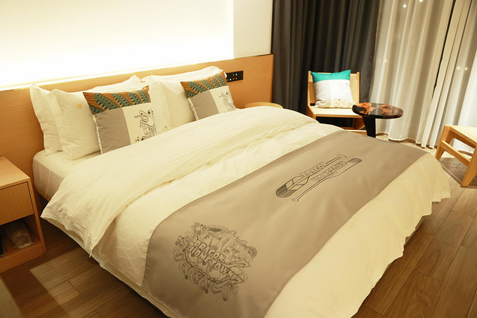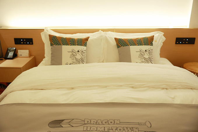 果然是龙舟主题,床品上就有龙舟的元素 ,方枕上面印着龙头的图案,被子上也印着划龙舟的桨。