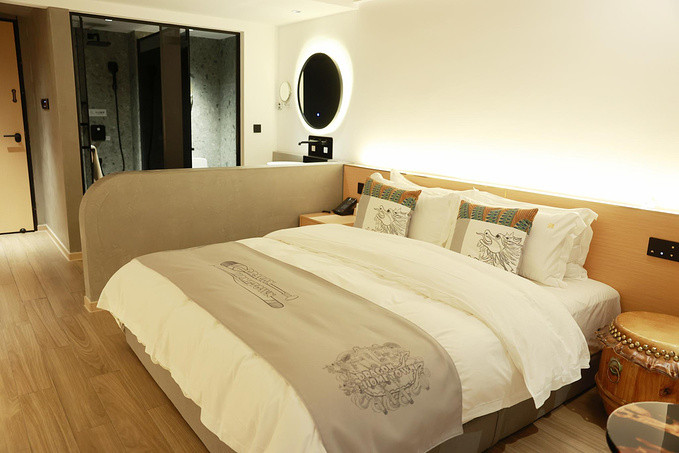 温馨的客房,一面鼓做的床头柜,挺有特色。