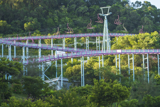 高空水滑道国内少有,全长520米,最高落差达57米,有7处弯道,靠水流从高空滑落,非常惊险刺激。